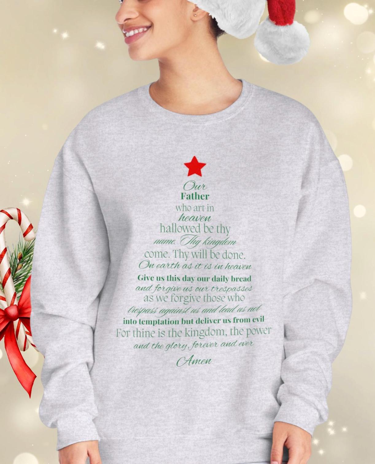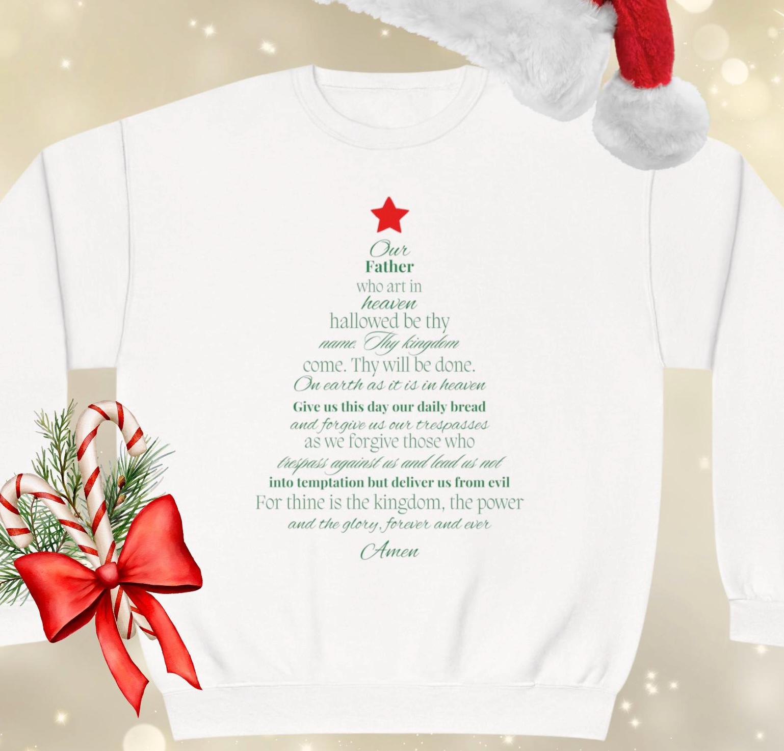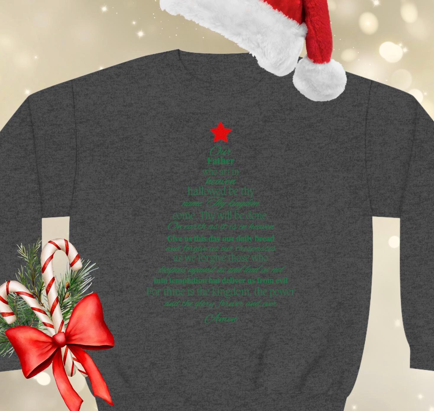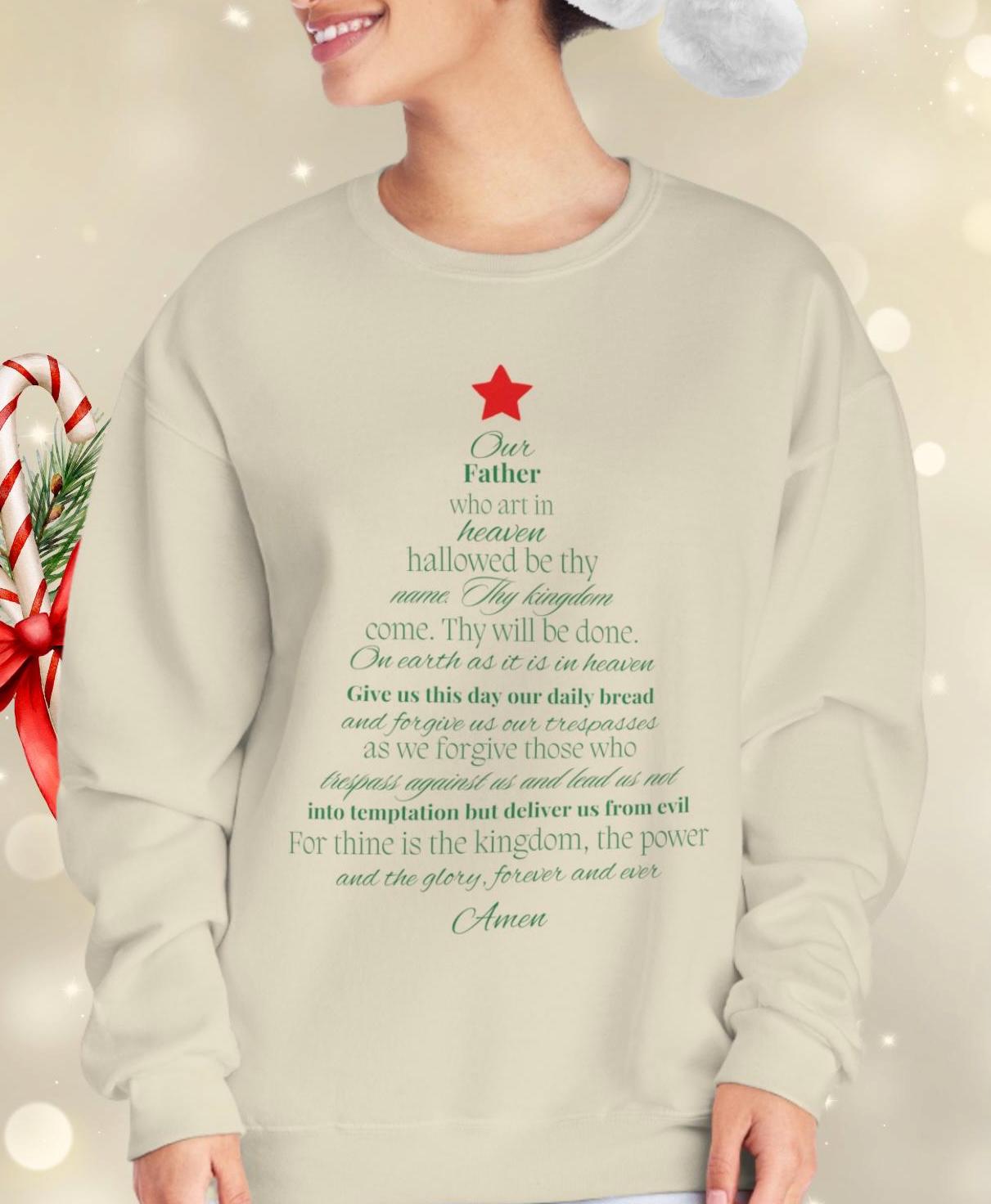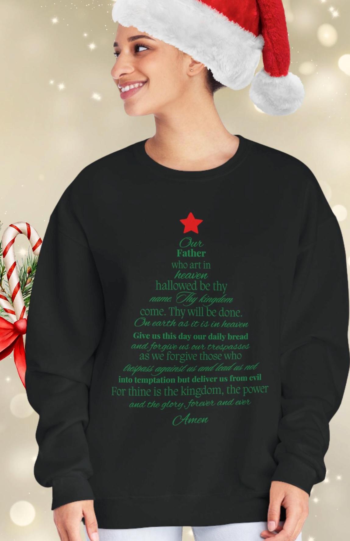 Christmas Sweatshirt Lord's Prayer Christmas Tree. Embrace the holiday spirit with our uniquely designed Christmas Sweatshirt featuring the Lord's Prayer shaped as a Christmas tree with a star on top. Crafted from a soft and comfortable cotton-poly blend, this sweatshirt offers a perfect balance of warmth, faith and comfort, making it ideal for cold winter days. Available in multiple sizes X to 3XL, it ensures a perfect fit for everyone.