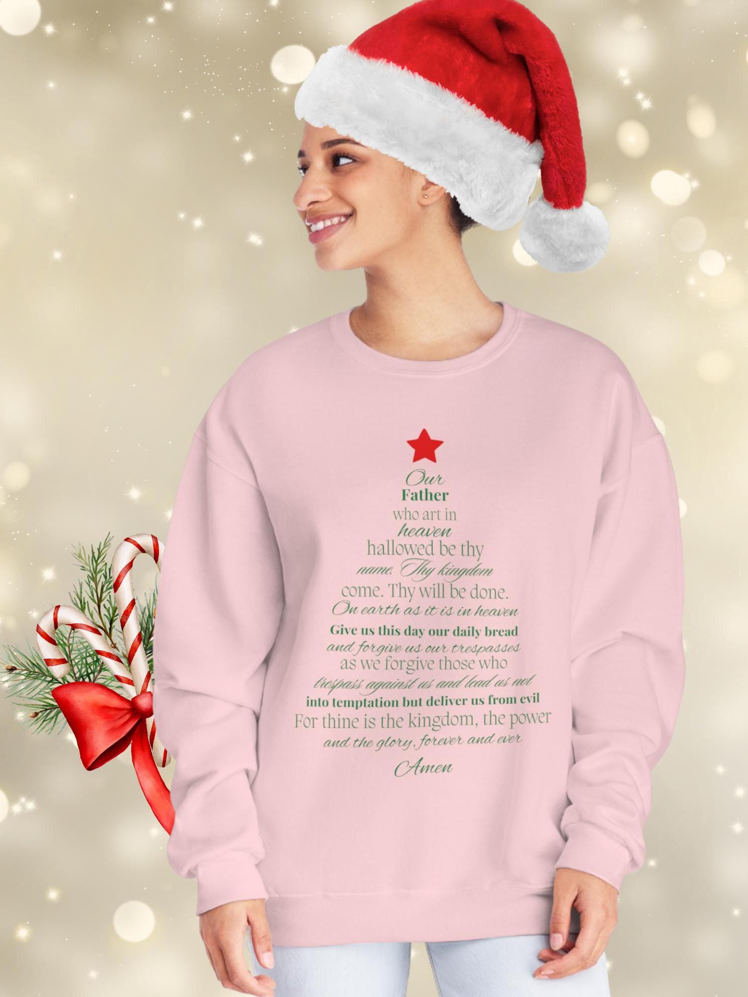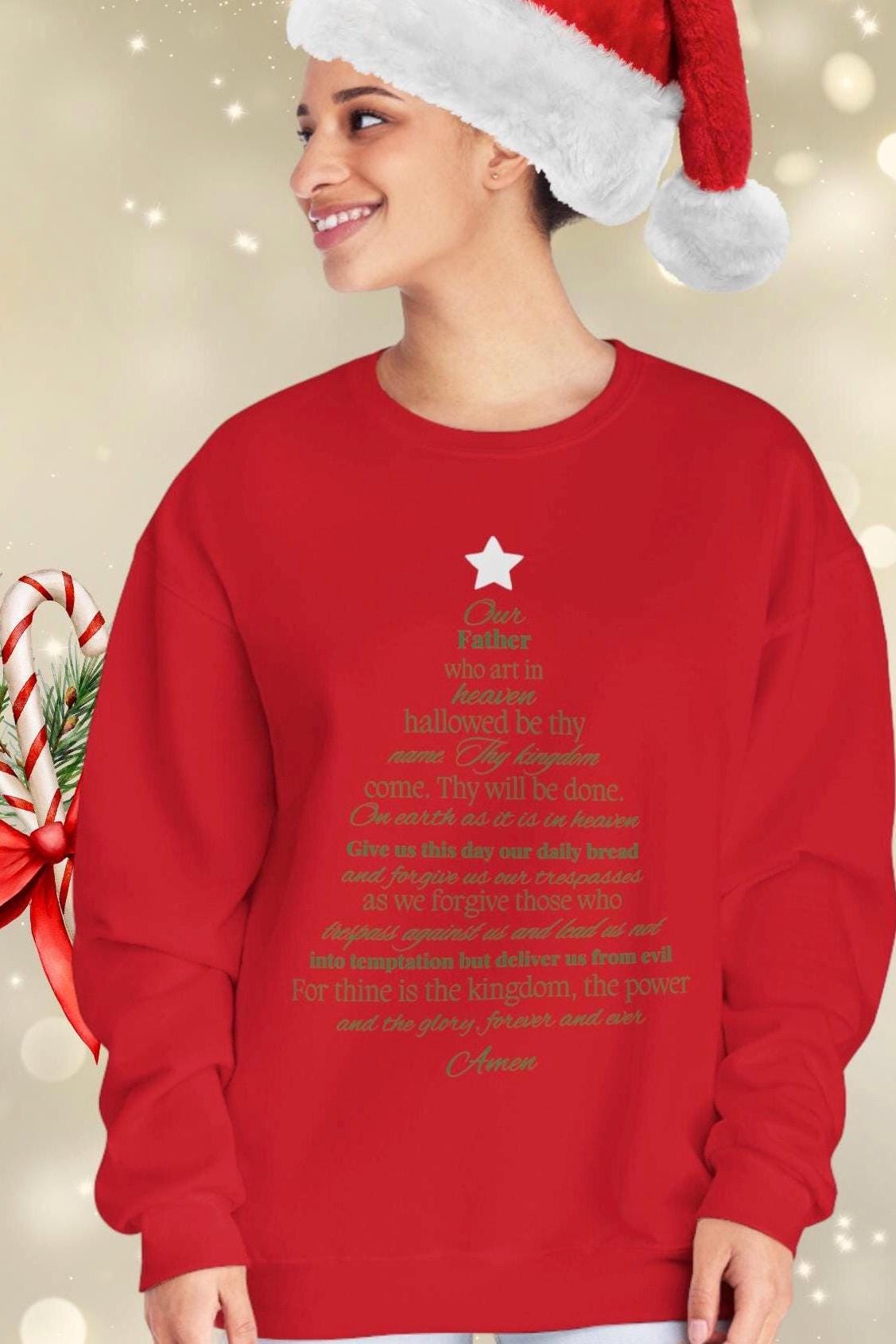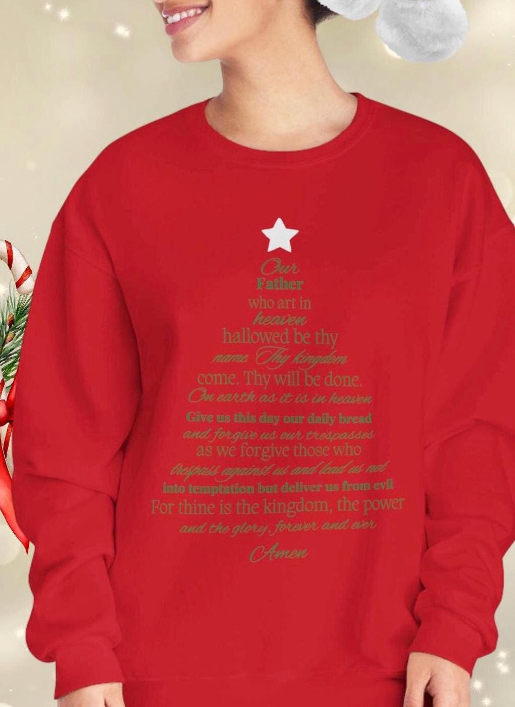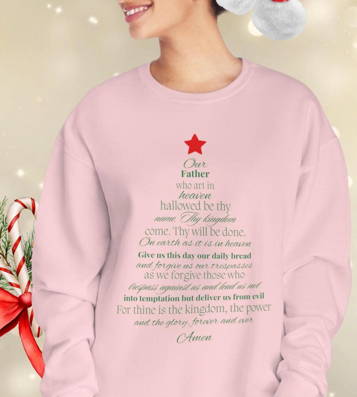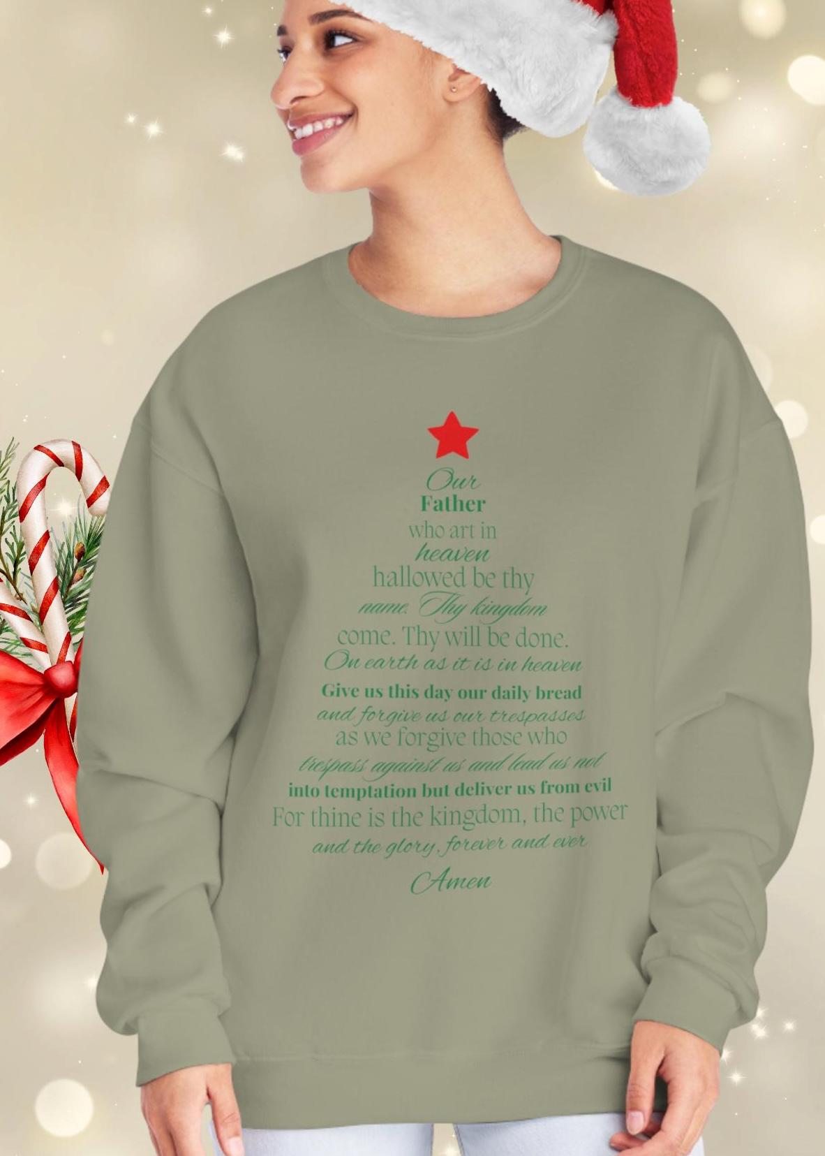 Christmas Sweatshirt Lord's Prayer Christmas Tree. Embrace the holiday spirit with our uniquely designed Christmas Sweatshirt featuring the Lord's Prayer shaped as a Christmas tree with a star on top. Crafted from a soft and comfortable cotton-poly blend, this sweatshirt offers a perfect balance of warmth, faith and comfort, making it ideal for cold winter days. Available in multiple sizes X to 3XL, it ensures a perfect fit for everyone.