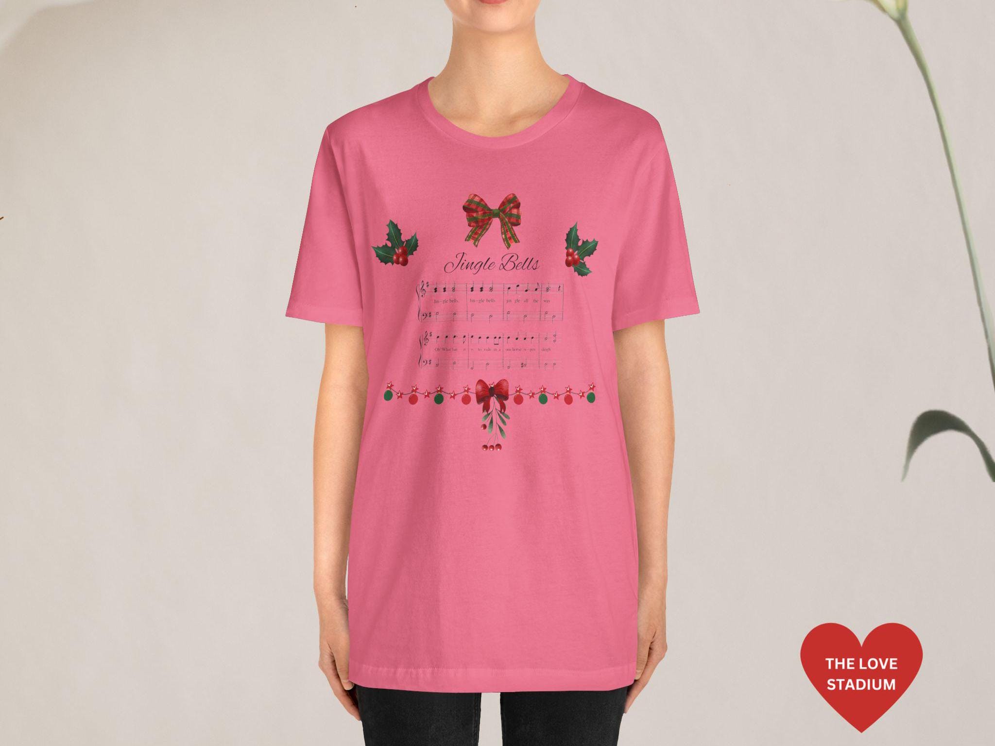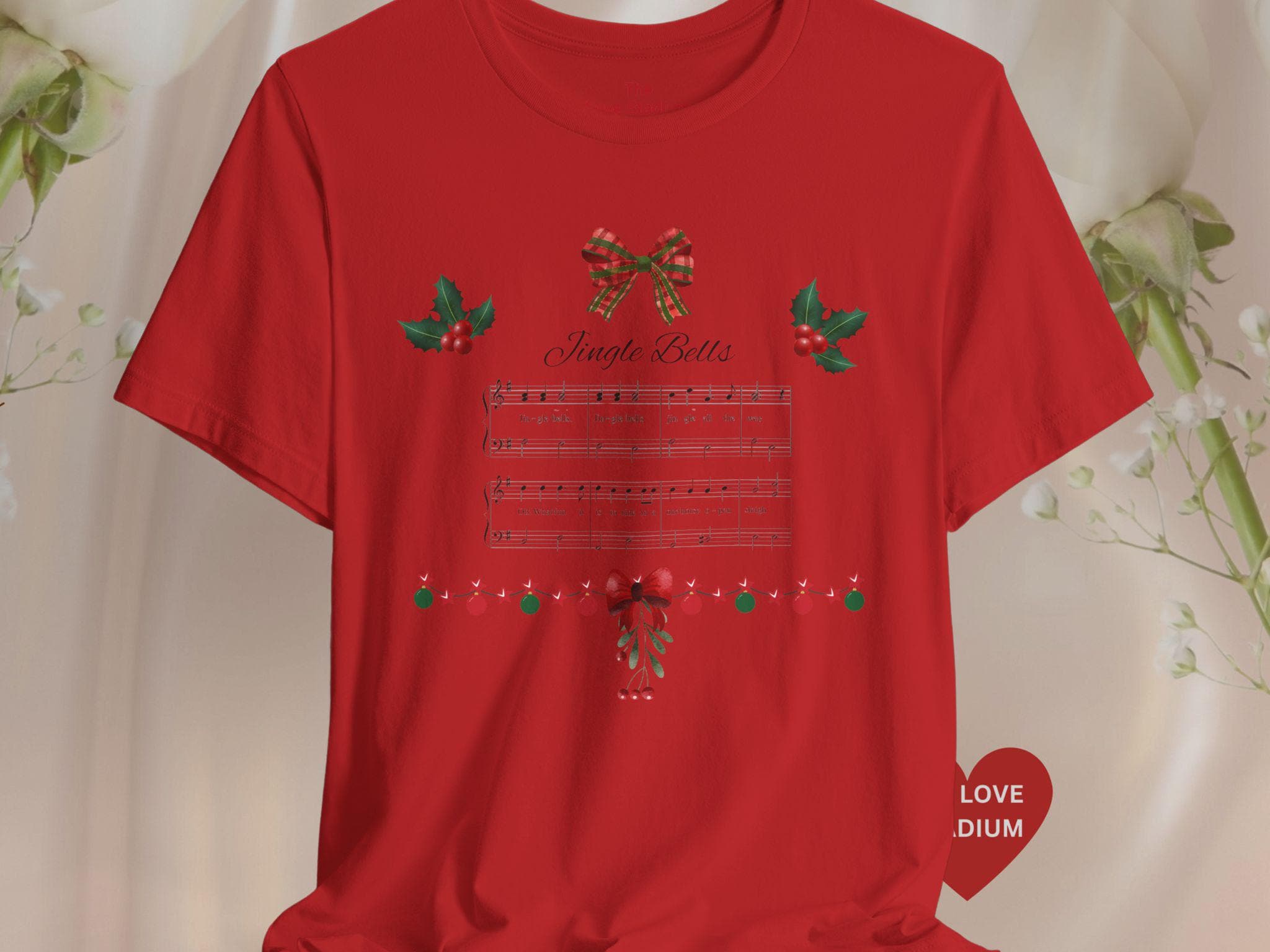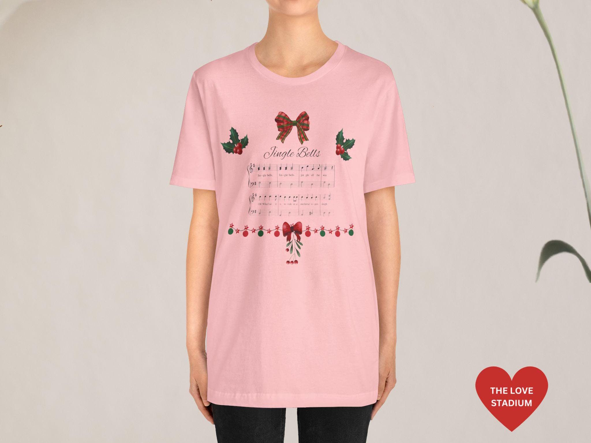 Jingle Bells Bow Merry Christmas Red Bow Shirt. Celebrate the magic of the festive season with our delightful Jingle Bells Music Sheet Christmas tshirt. This cozy sweater features music sheet of Jingle Bells and red coquette bow making it a perfect singing family Merry Christmas design that pays homage to your family sing a long, making it a perfect addition to your holiday wardrobe. Whether you're enjoying a festive gathering or simply lounging at home, this Christmas tshirt will keep you happy. It's an ideal Christmas gift for any music lover or anyone who adores Christmas. Get ready to spread holiday cheer with this beautiful Jingle Bells Merry Christmas tee, perfect for celebrating the season in comfort and style!