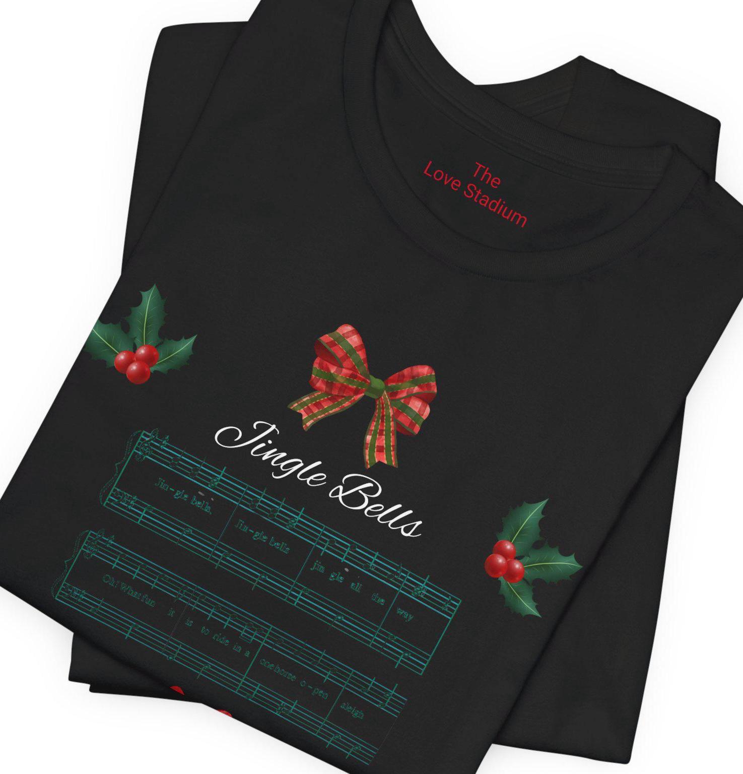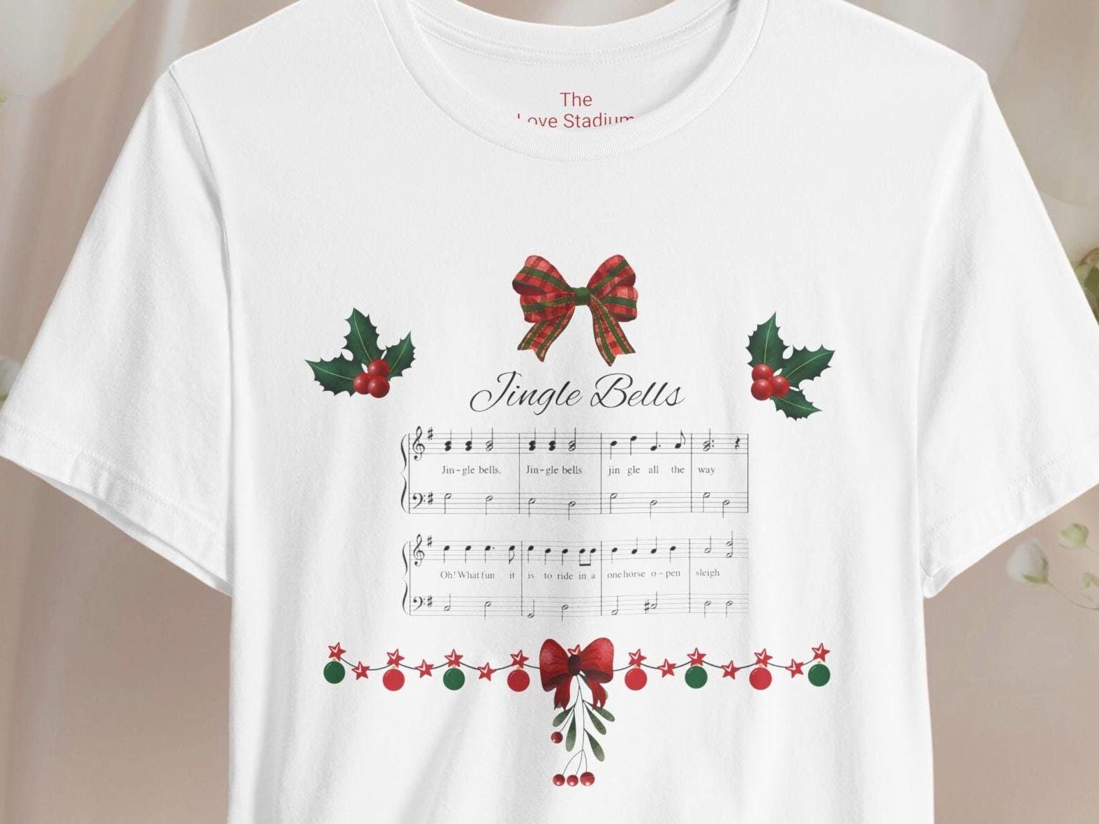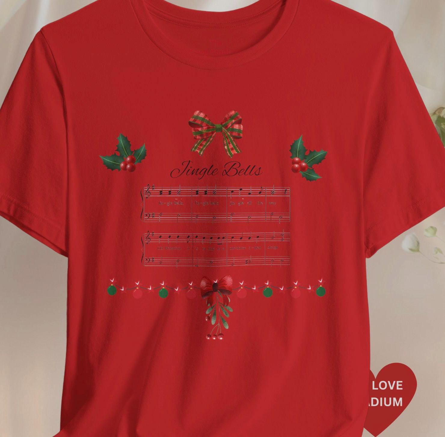 Jingle Bells Bow Merry Christmas Red Bow Shirt. Celebrate the magic of the festive season with our delightful Jingle Bells Music Sheet Christmas tshirt. This cozy sweater features music sheet of Jingle Bells and red coquette bow making it a perfect singing family Merry Christmas design that pays homage to your family sing a long, making it a perfect addition to your holiday wardrobe. Whether you're enjoying a festive gathering or simply lounging at home, this Christmas tshirt will keep you happy. It's an ideal Christmas gift for any music lover or anyone who adores Christmas. Get ready to spread holiday cheer with this beautiful Jingle Bells Merry Christmas tee, perfect for celebrating the season in comfort and style!
