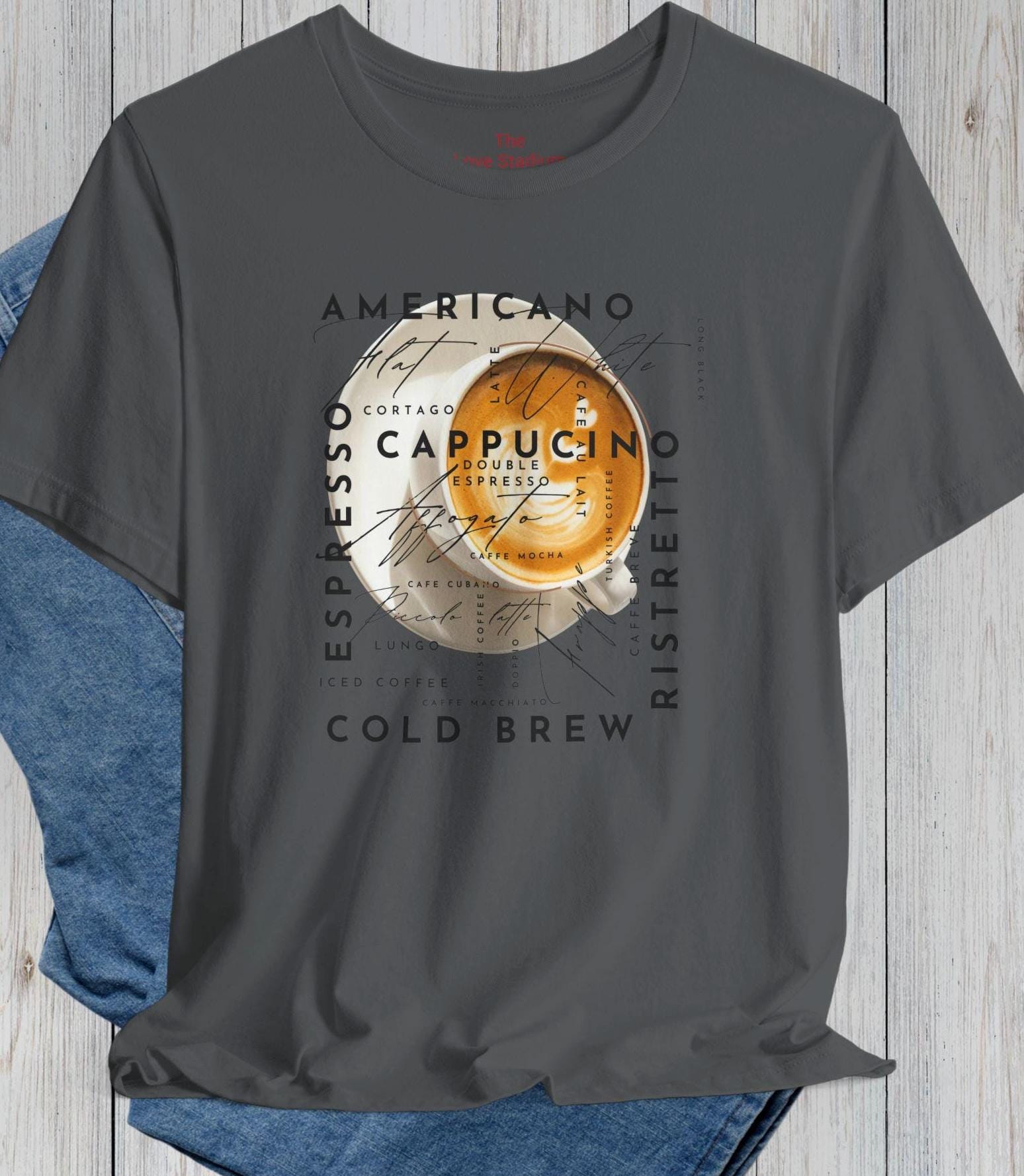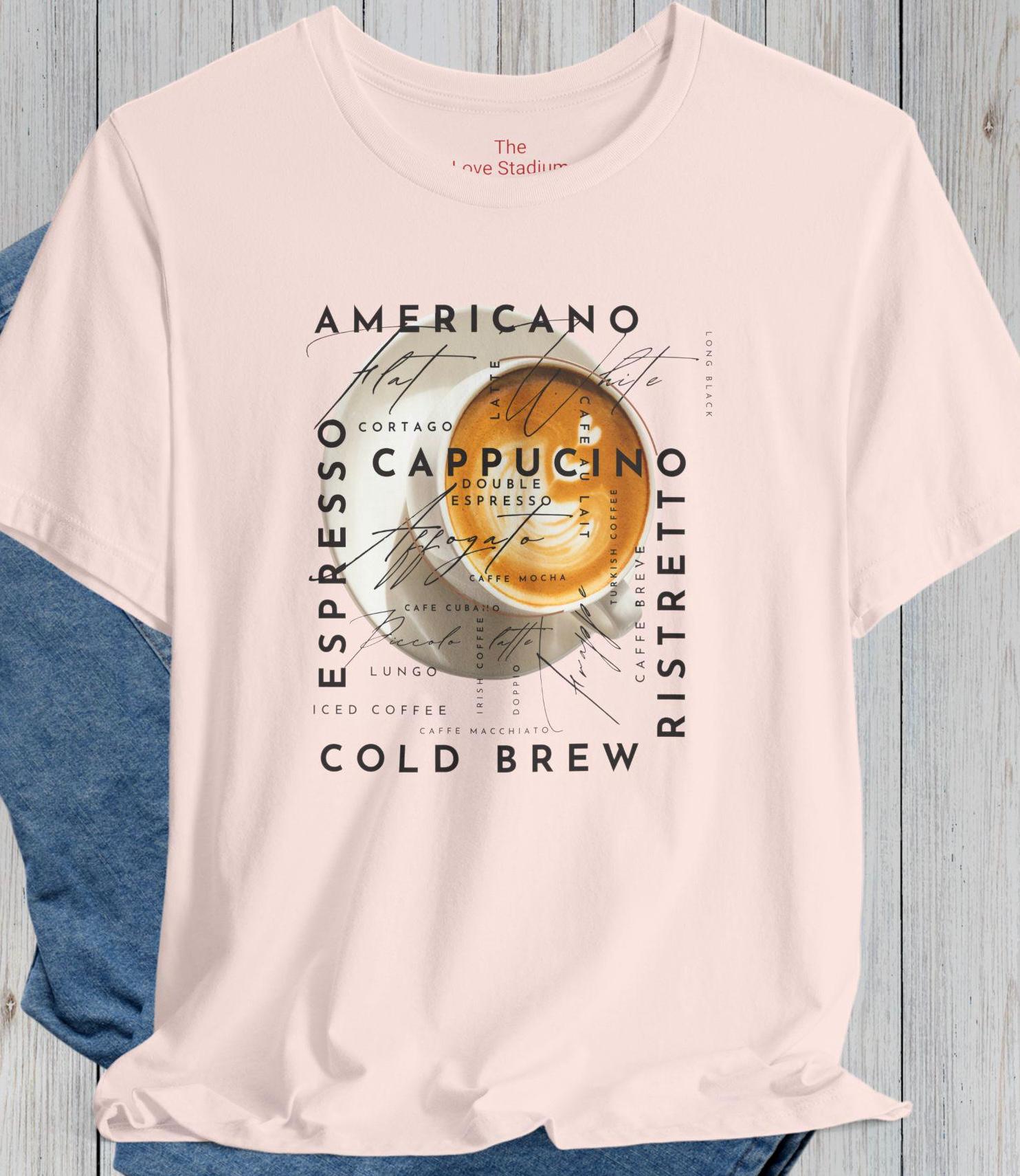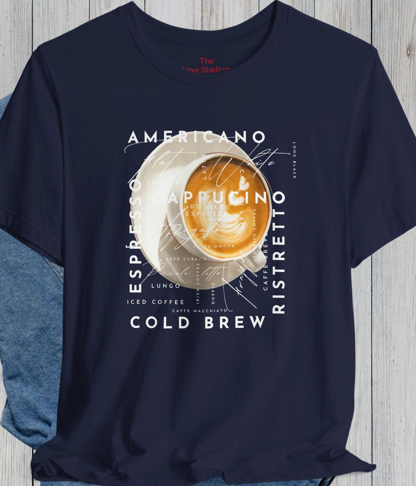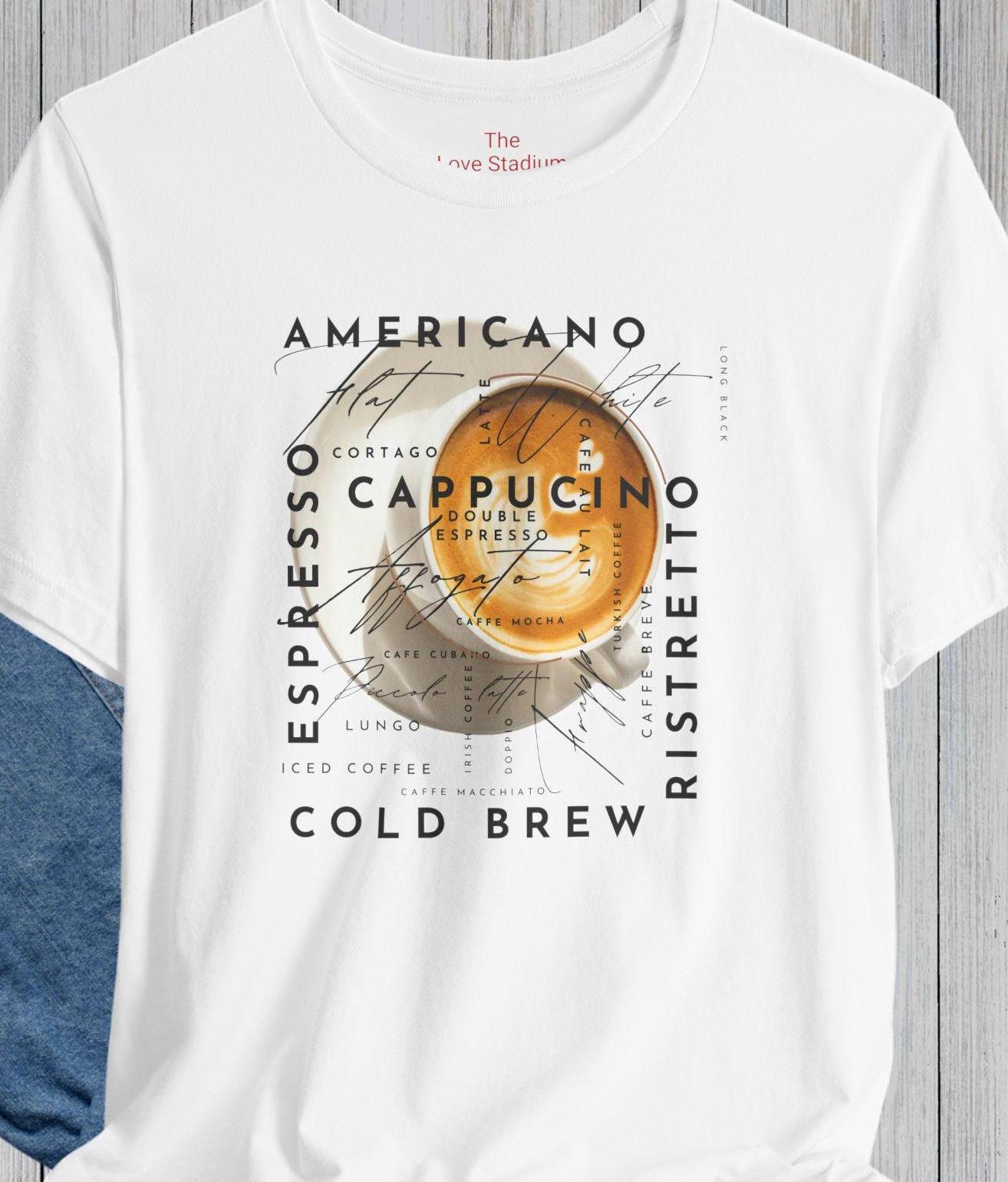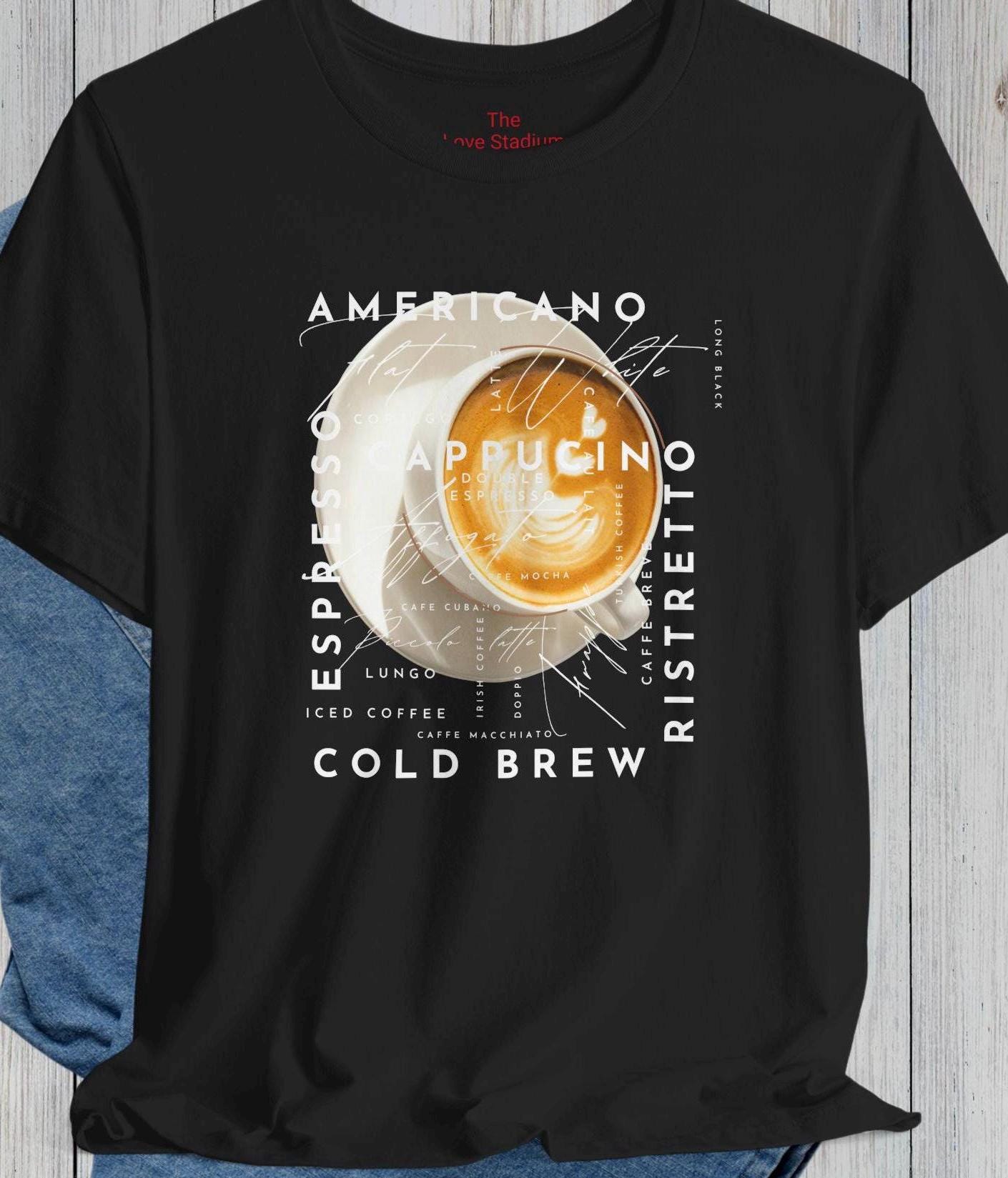 **Coffee Shirt. Iced Coffee, Americano, Latte Shirt Wordcloud Coffee T-Shirt** Brew some buzz with our unique Coffee Tshirt. This iced coffee latte shirt features word cloud design, bursting with delightful coffee related vocabulary buzz that any caffeine enthusiast will adore. Showcase your love for coffee in a creative and luxury way. Made from 100% soft, breathable cotton, this shirt is perfect for lounging at home, grabbing a coffee with friends, or even hitting the local café for your favorite brew.