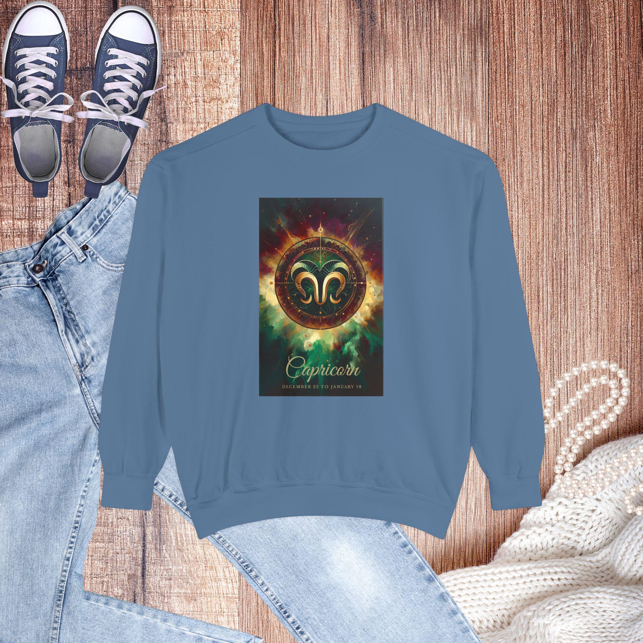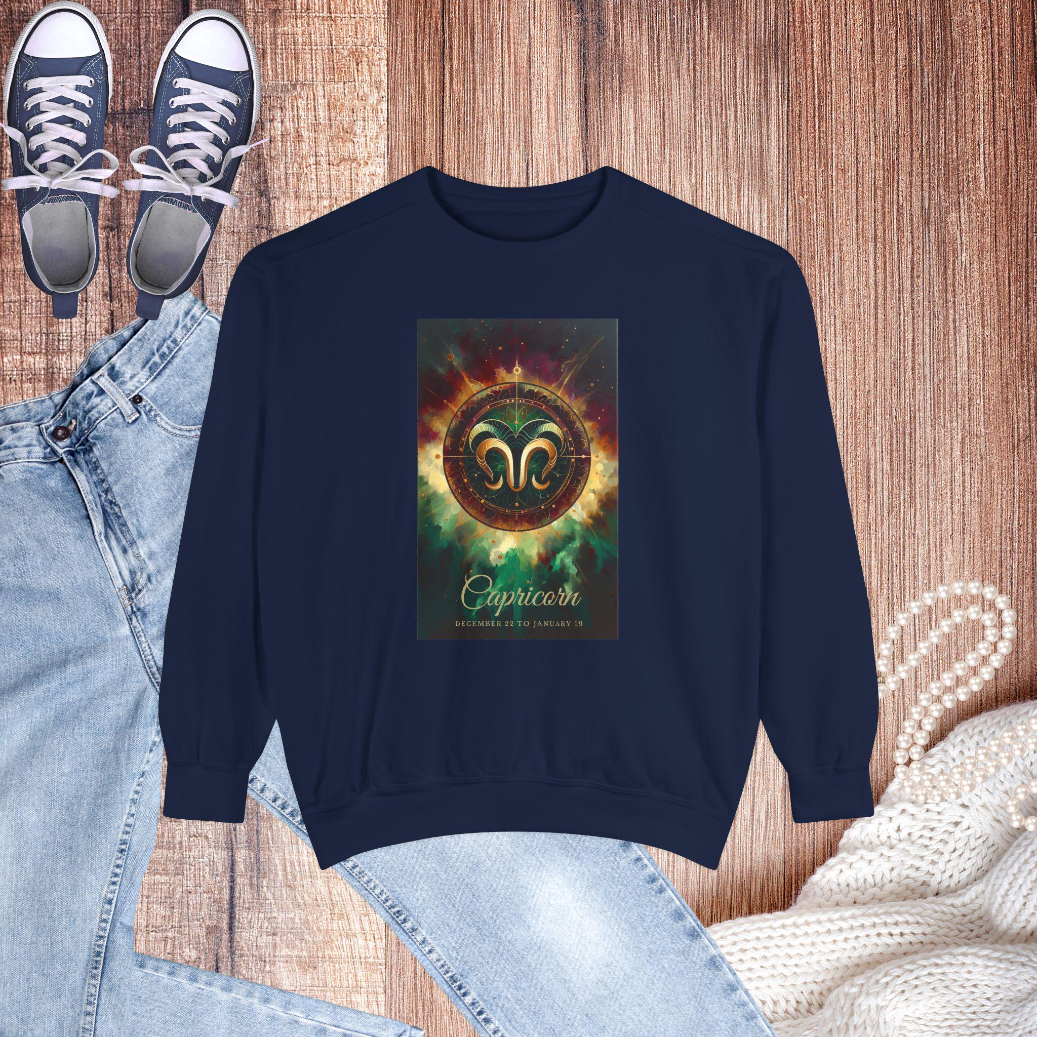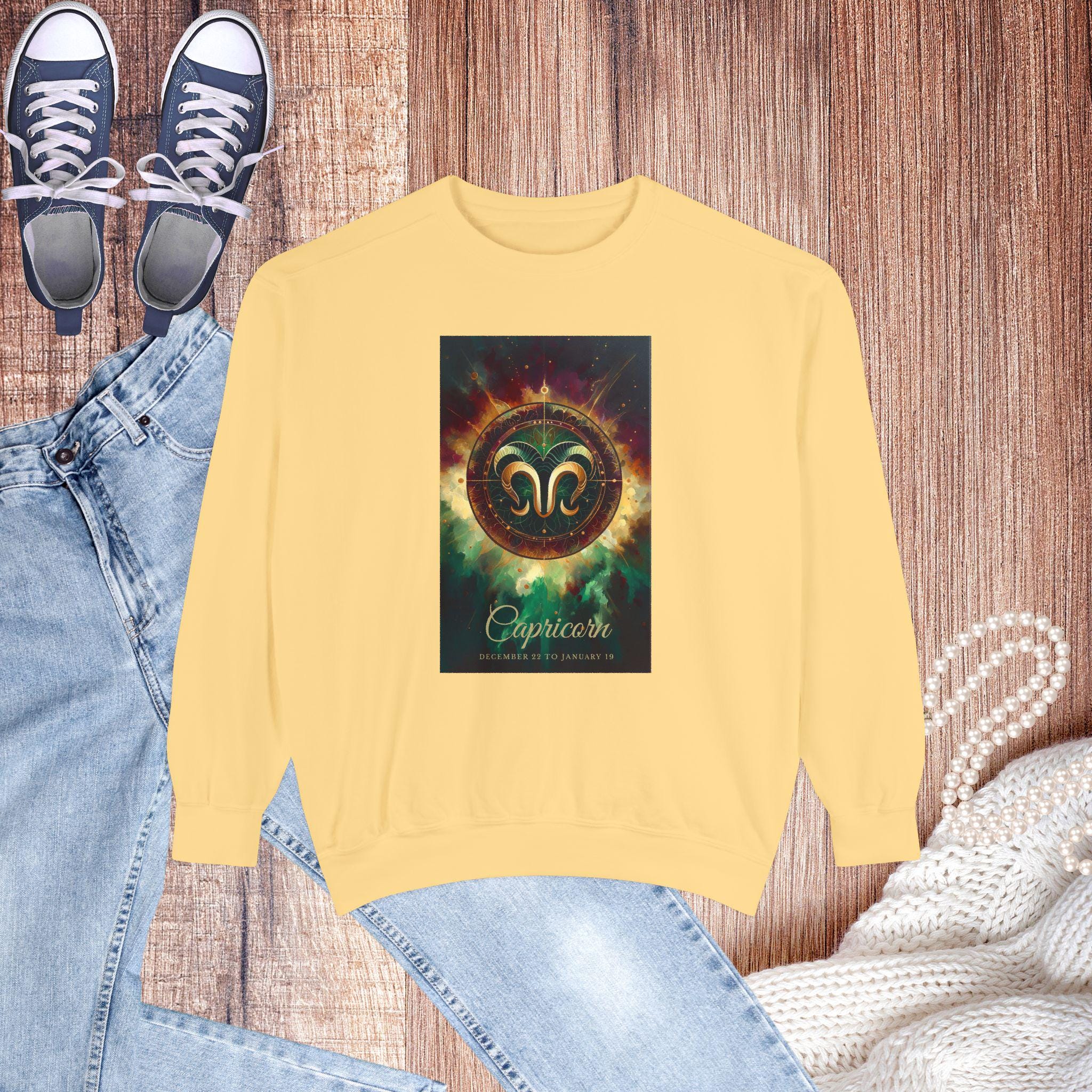 Comfort Colors® ***Capricorn Zodiac Shirt*** Celebrate the holiday season with our luxurious astrology hand painted look gold and black Capricorn Sweatshirt, designed especially for January Birthday festivities and those who love adding a touch of luxury to their wardrobe. Crafted from soft, high-quality cotton blend, this cozy crewneck sweater ensures all-day comfort whether you're participating in holiday family photos, having a birthday party, Christmas party, or cozying up by the fire. Its Acrylic painting of a Capricorn design makes it a memorable and stylish choice for a birthday gift and occasions.