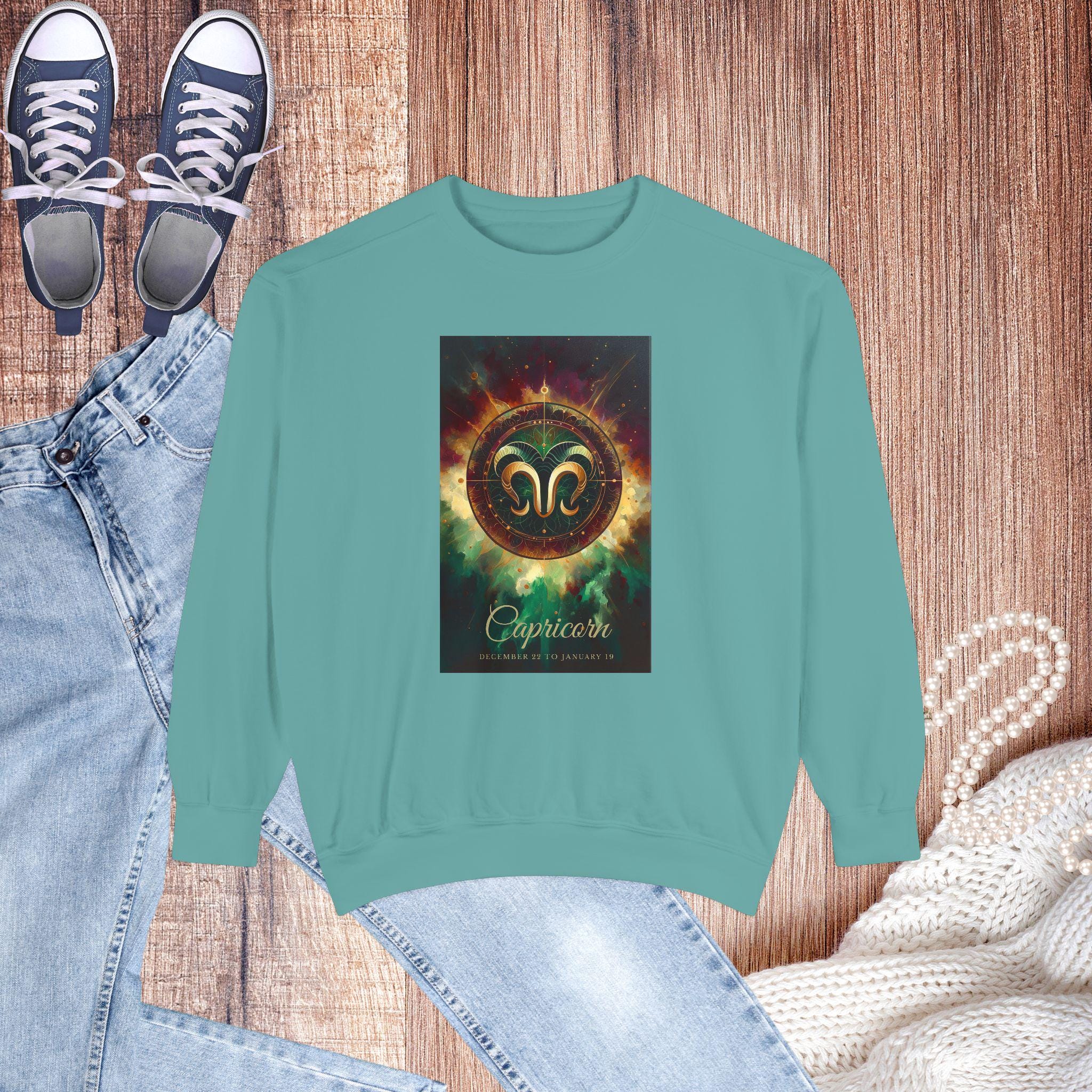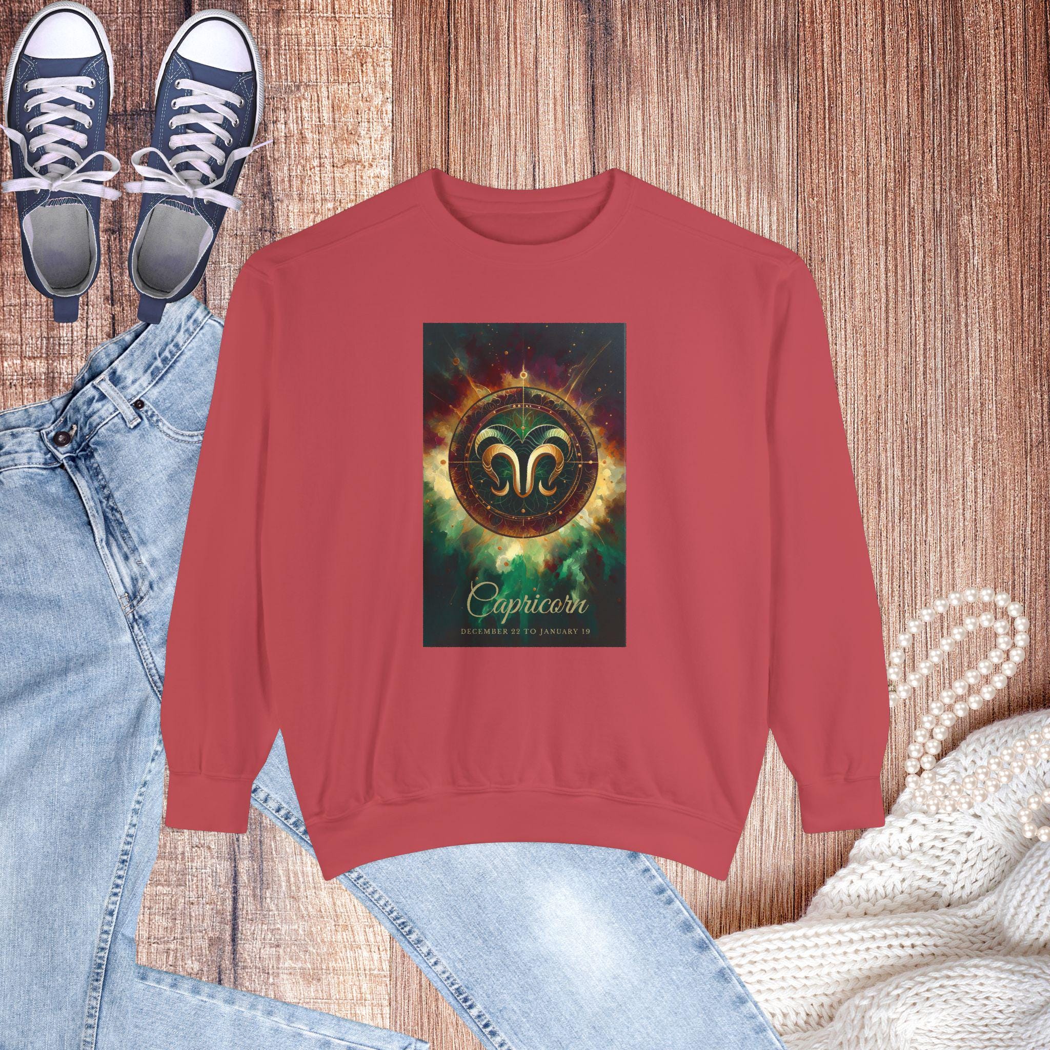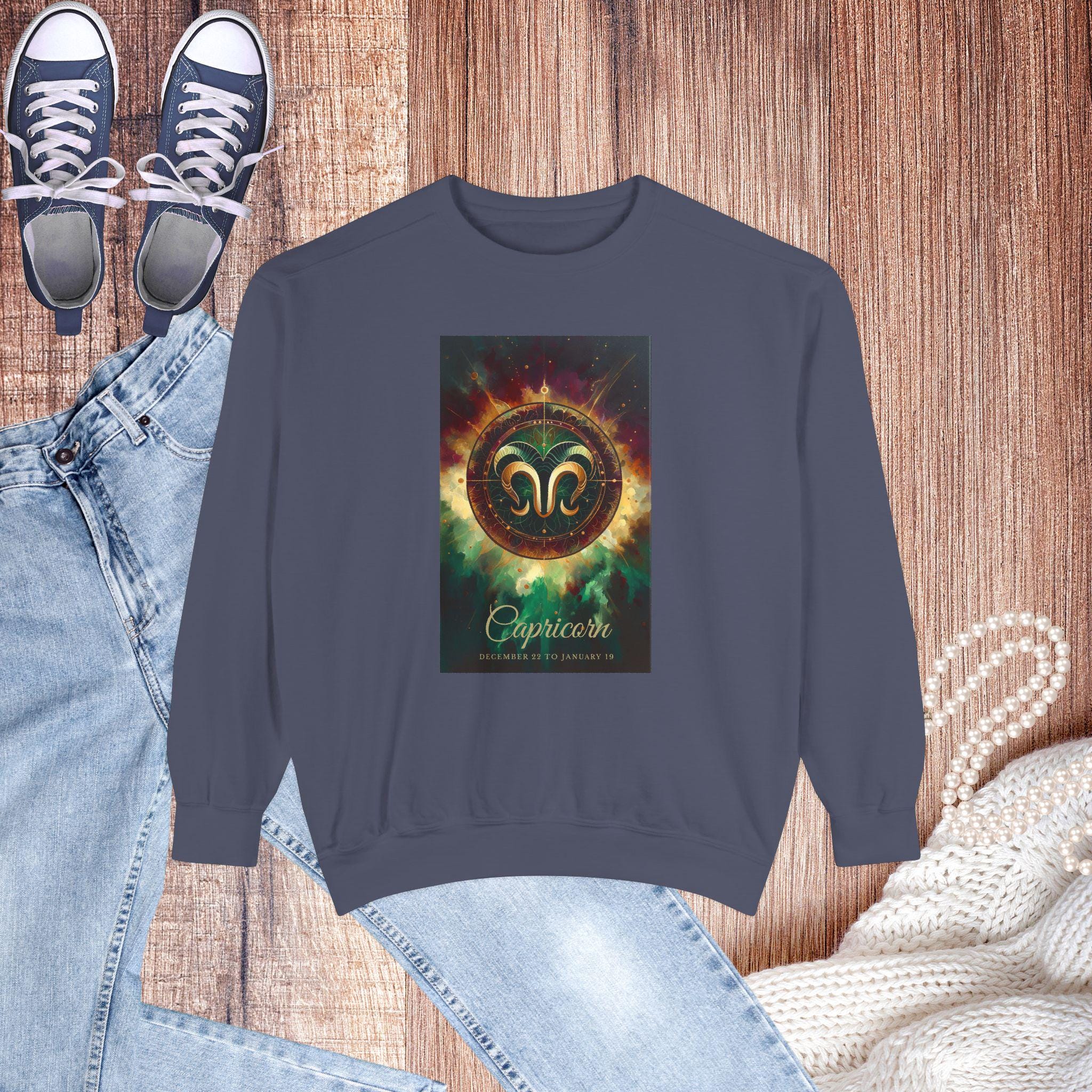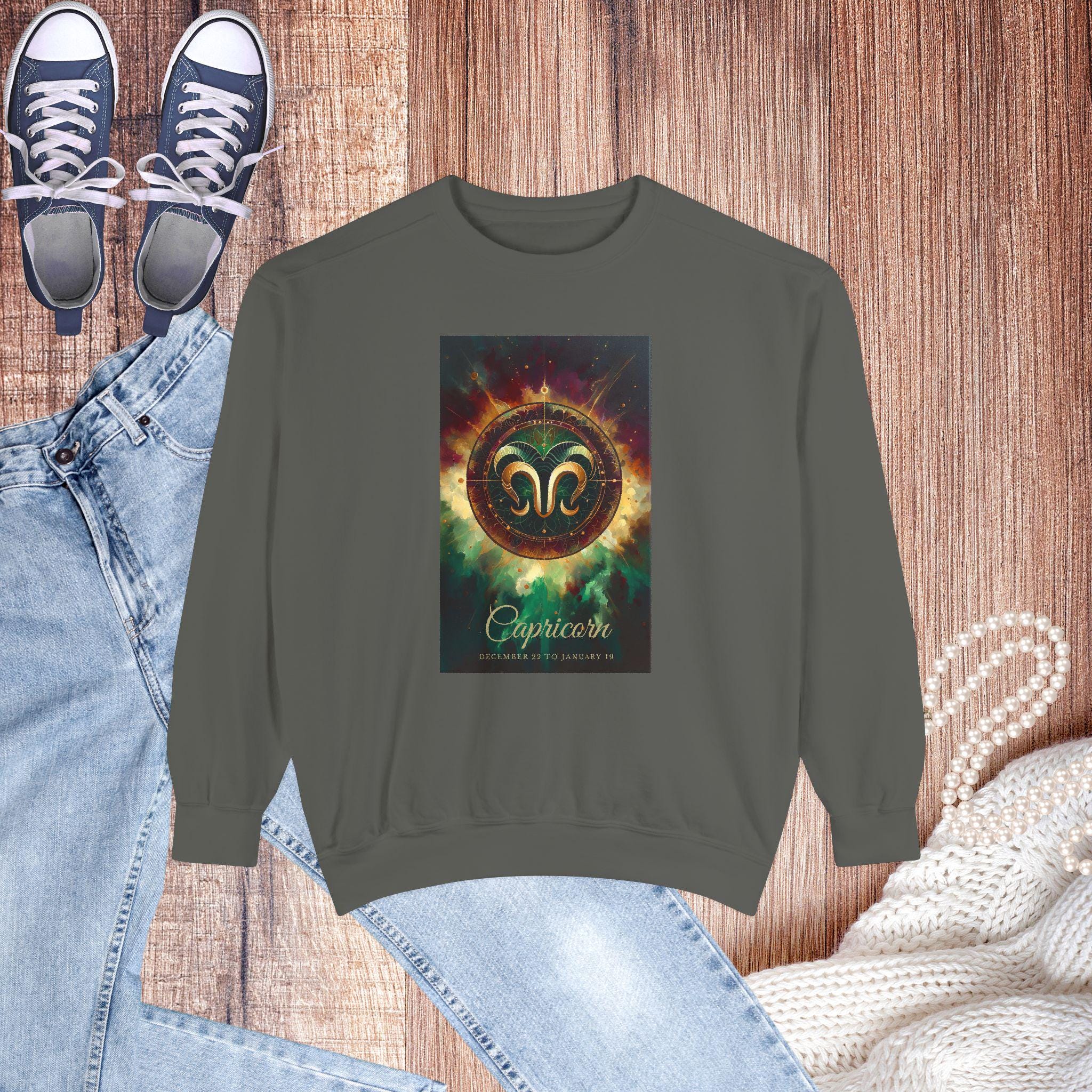 Comfort Colors® ***Capricorn Zodiac Shirt*** Celebrate the holiday season with our luxurious astrology hand painted look gold and black Capricorn Sweatshirt, designed especially for January Birthday festivities and those who love adding a touch of luxury to their wardrobe. Crafted from soft, high-quality cotton blend, this cozy crewneck sweater ensures all-day comfort whether you're participating in holiday family photos, having a birthday party, Christmas party, or cozying up by the fire. Its Acrylic painting of a Capricorn design makes it a memorable and stylish choice for a birthday gift and occasions.
