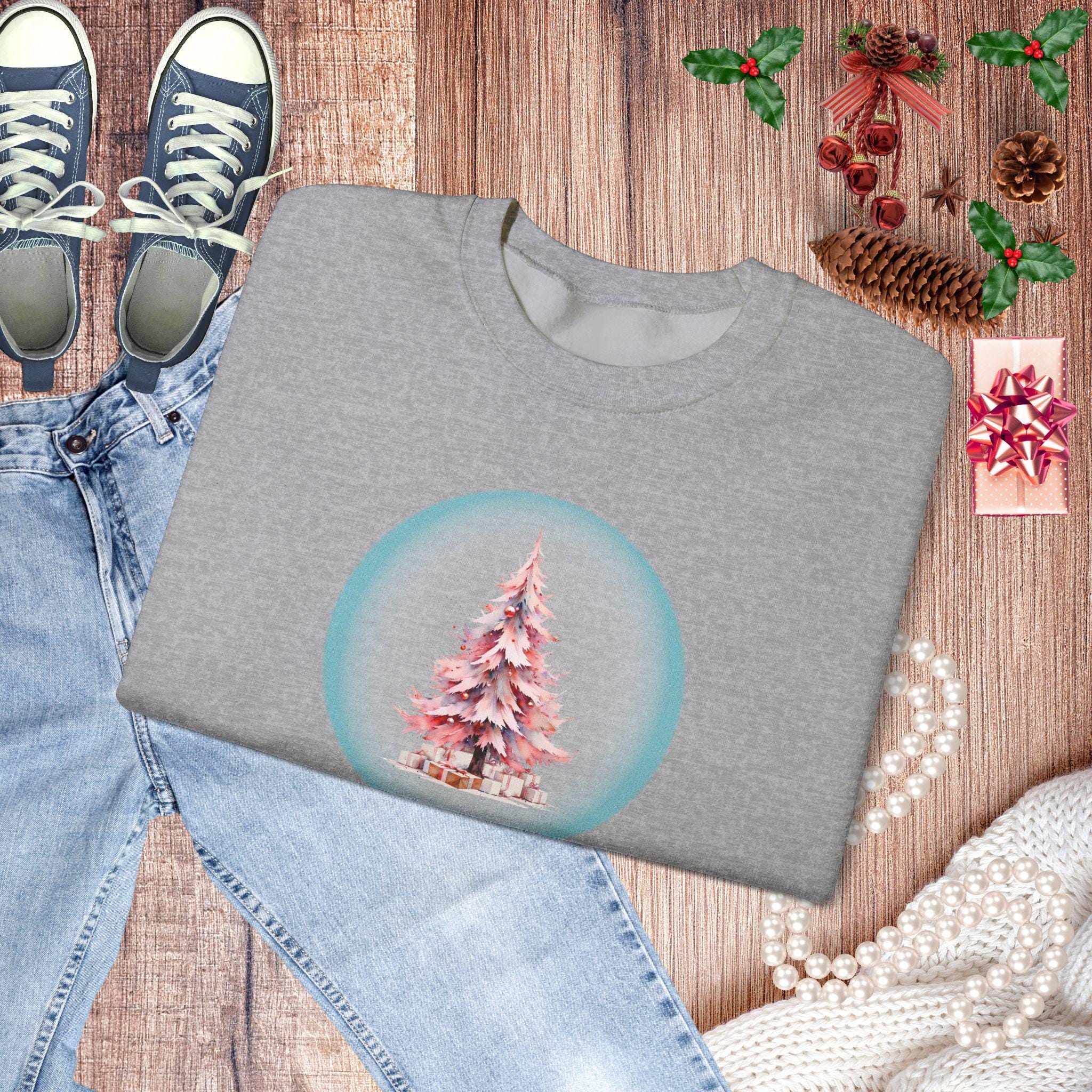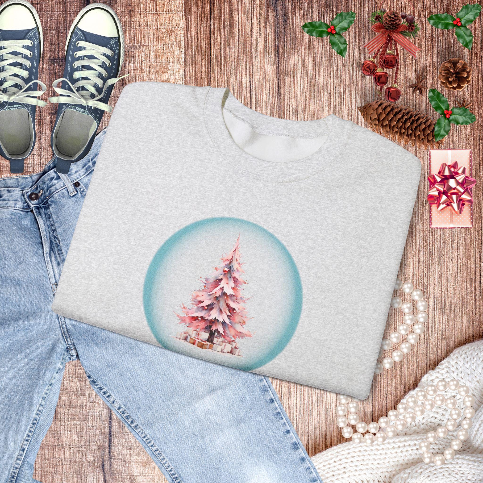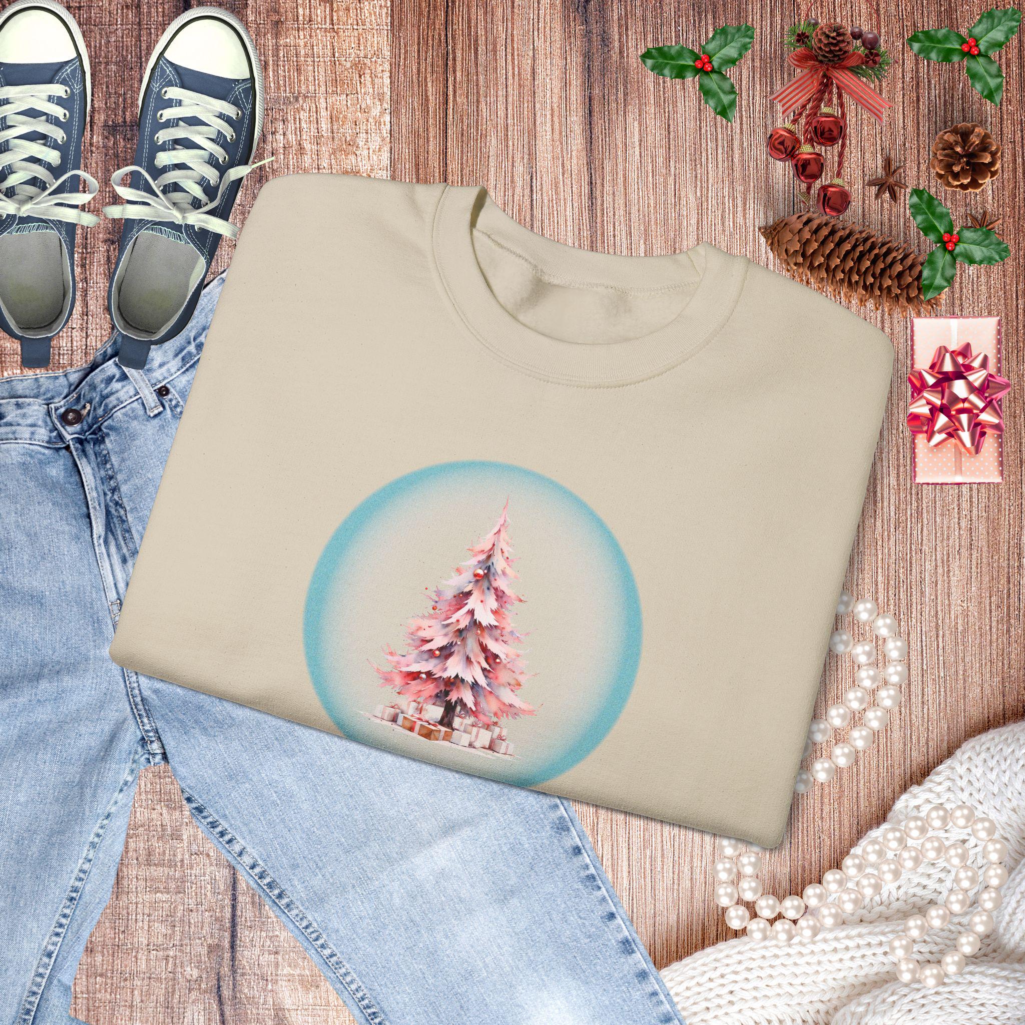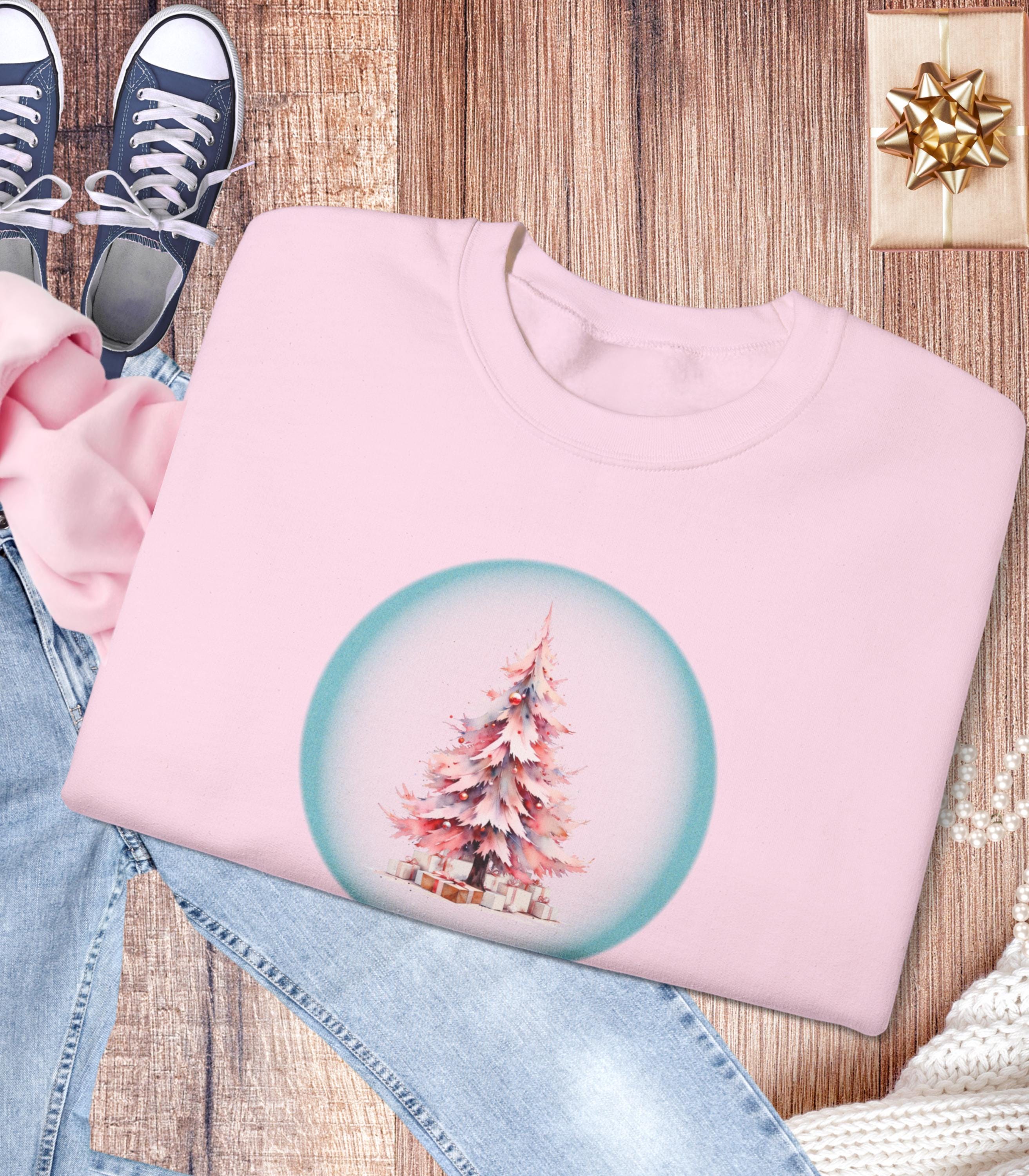 Adorable Pink Retro Christmas Snowglobe Sweatshirt for Women. Celebrate the holiday season in style with our adorable Christmas Tree festive matching sweatshirts for your Christmas Day celebrations. Printed on soft high quality cotton and polyester blend Gildan pullover, this cozy crewneck features a charming snowglobe design that captures the magic of Christmas in a playful, vintage watercolor painting inspired design. It is the comfortable fit that makes it perfect for layering and all day wear during the festive season.