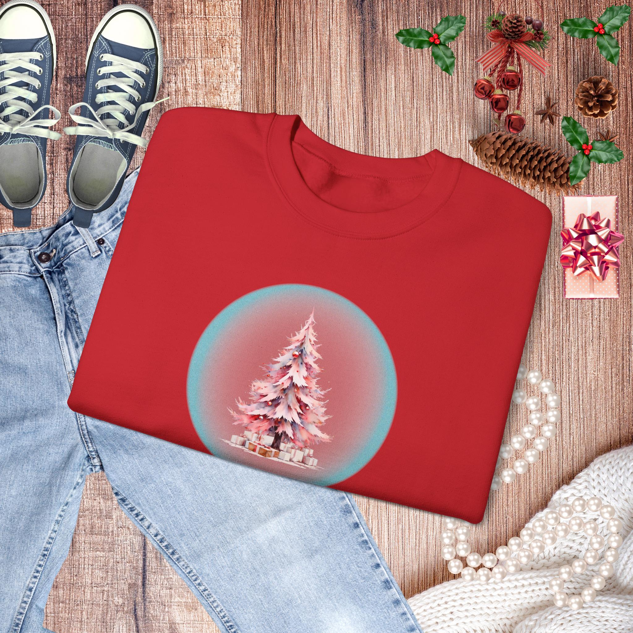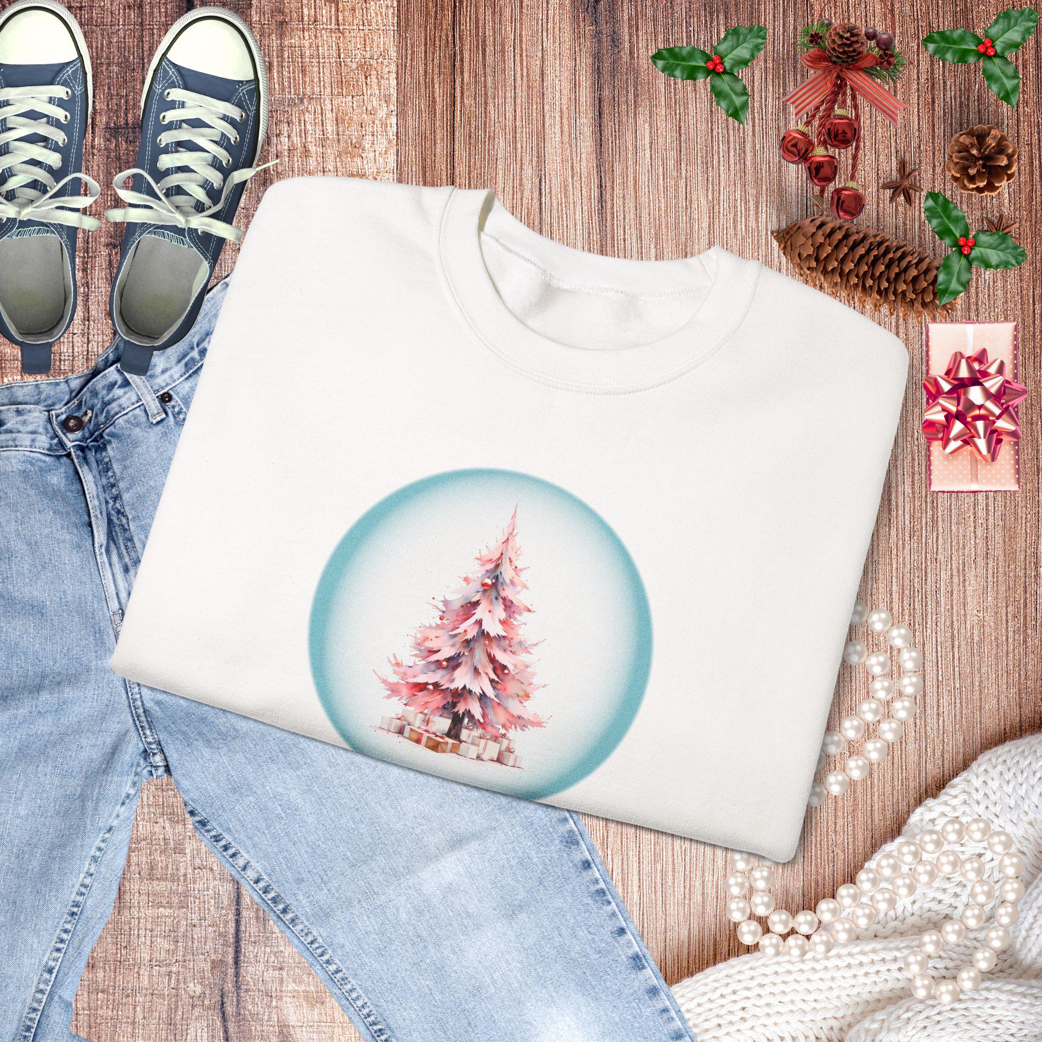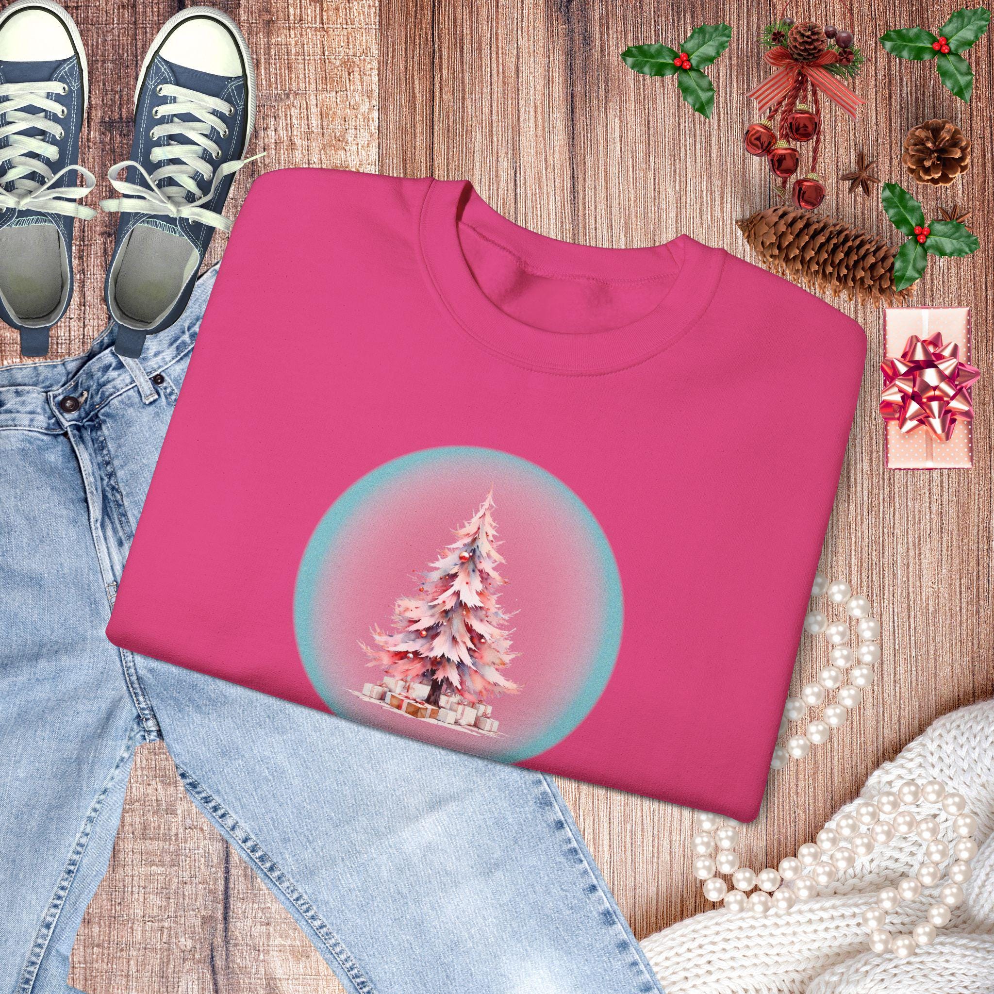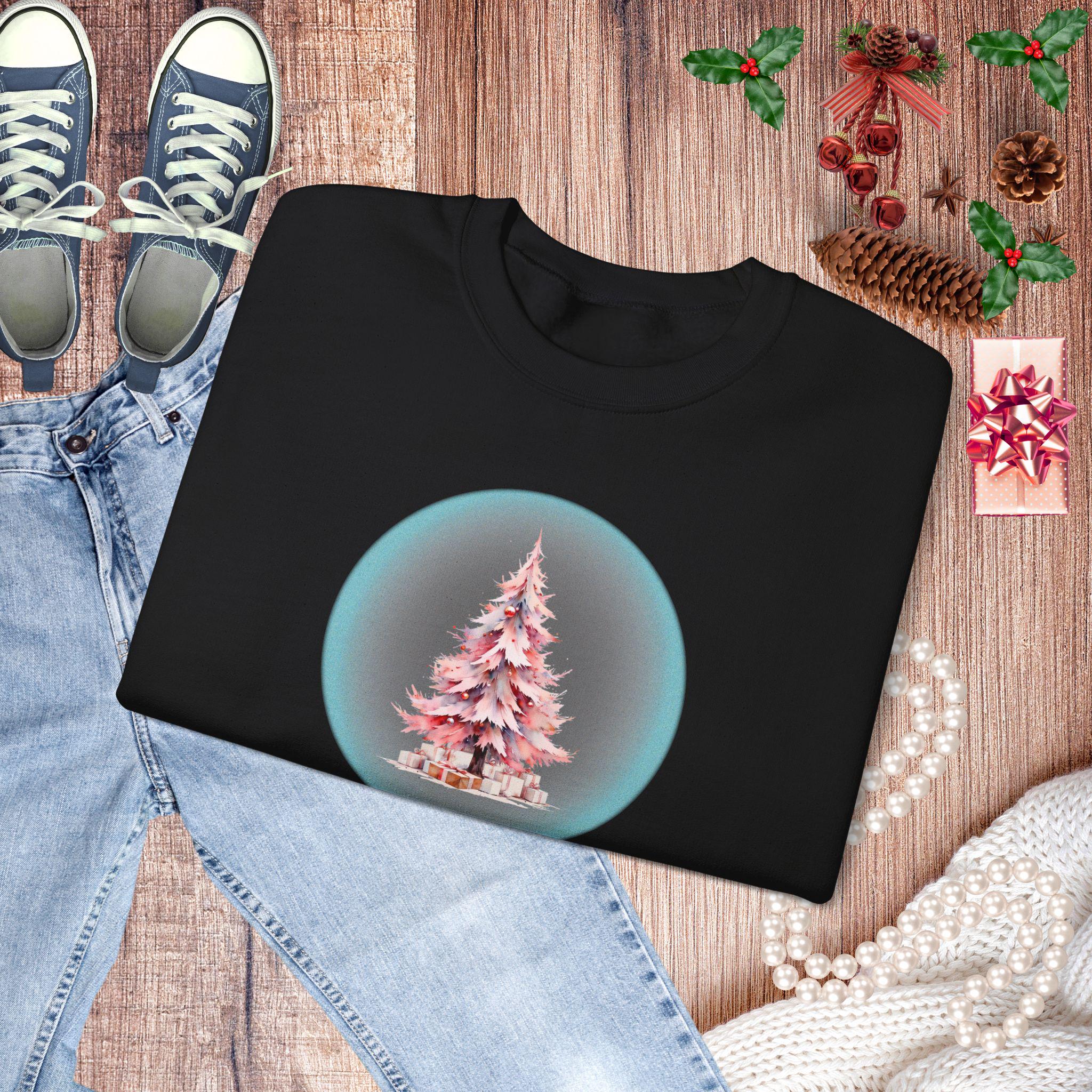 Adorable Pink Retro Christmas Snowglobe Sweatshirt for Women. Celebrate the holiday season in style with our adorable Christmas Tree festive matching sweatshirts for your Christmas Day celebrations. Printed on soft high quality cotton and polyester blend Gildan pullover, this cozy crewneck features a charming snowglobe design that captures the magic of Christmas in a playful, vintage watercolor painting inspired design. It is the comfortable fit that makes it perfect for layering and all day wear during the festive season.