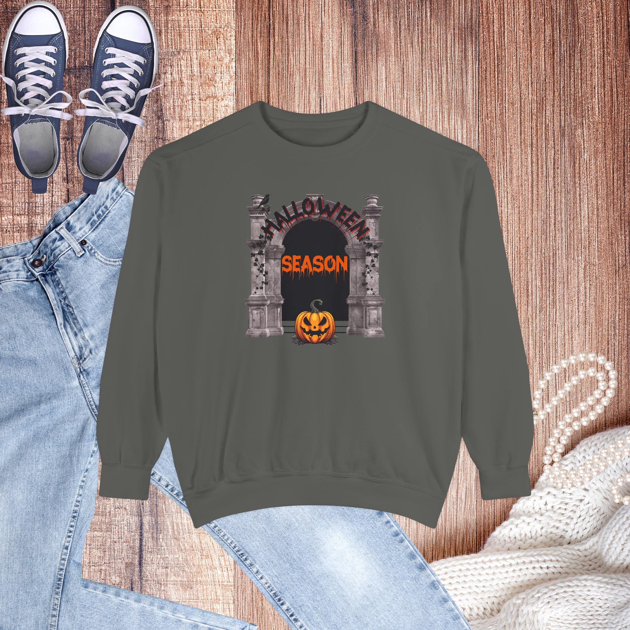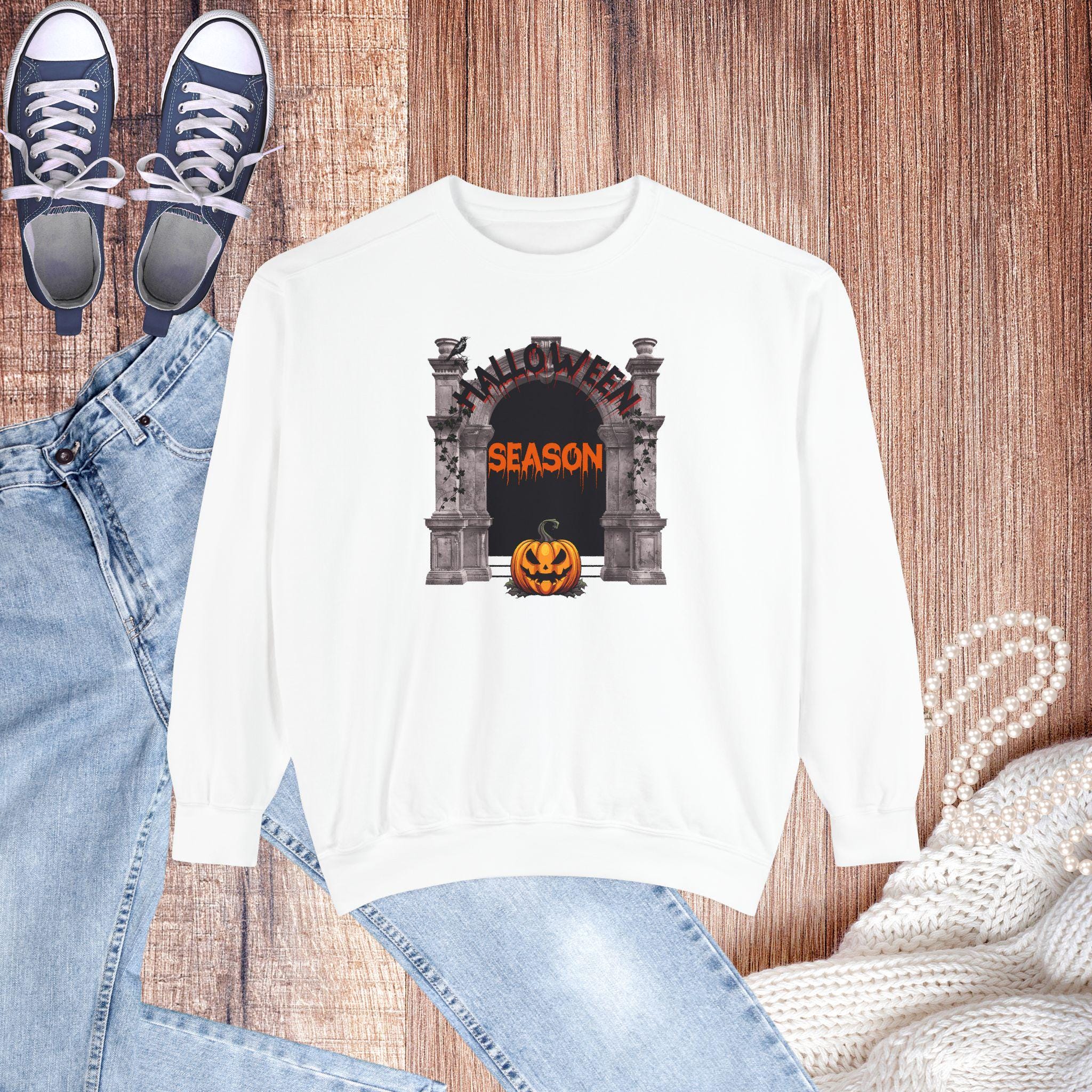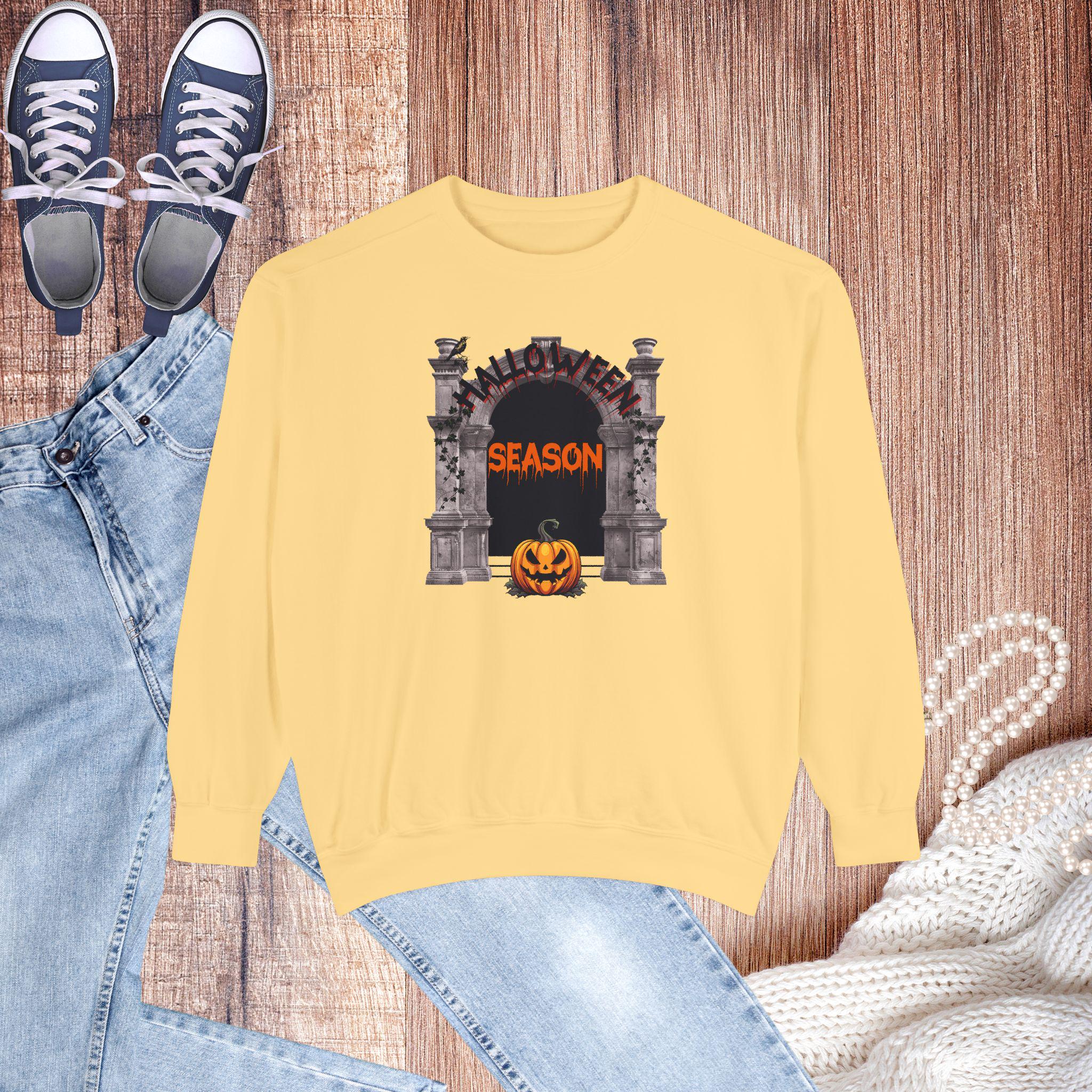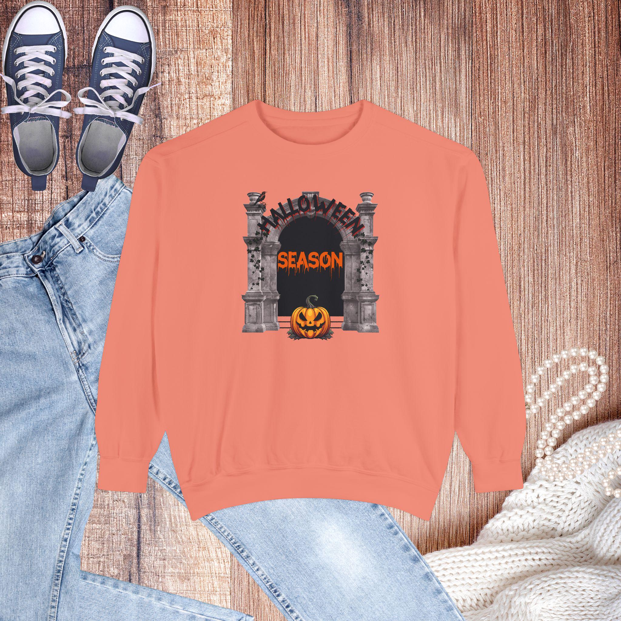 🎃 Comfort Colors “Halloween Season” Sweatshirt – Spooky Cute Vintage Vibes 🎃 Step into spooky season in style! This premium Comfort Colors sweatshirt features a creepy gothic arch, crawling ivy, and a glowing jack-o’-lantern, capturing the perfect mix of vintage horror and trendy Halloween aesthetic.