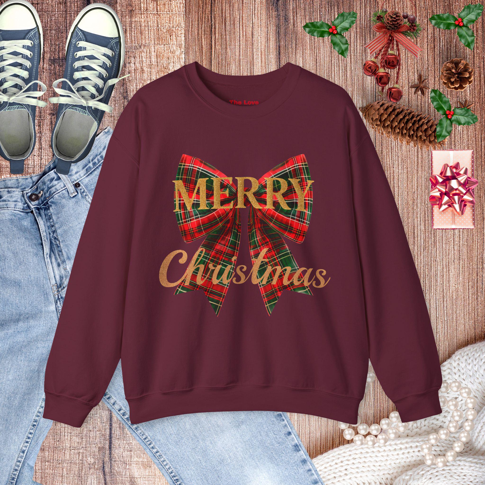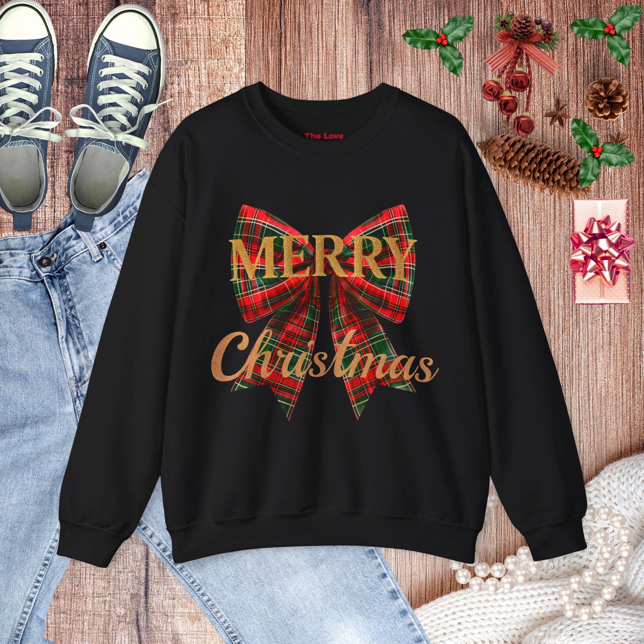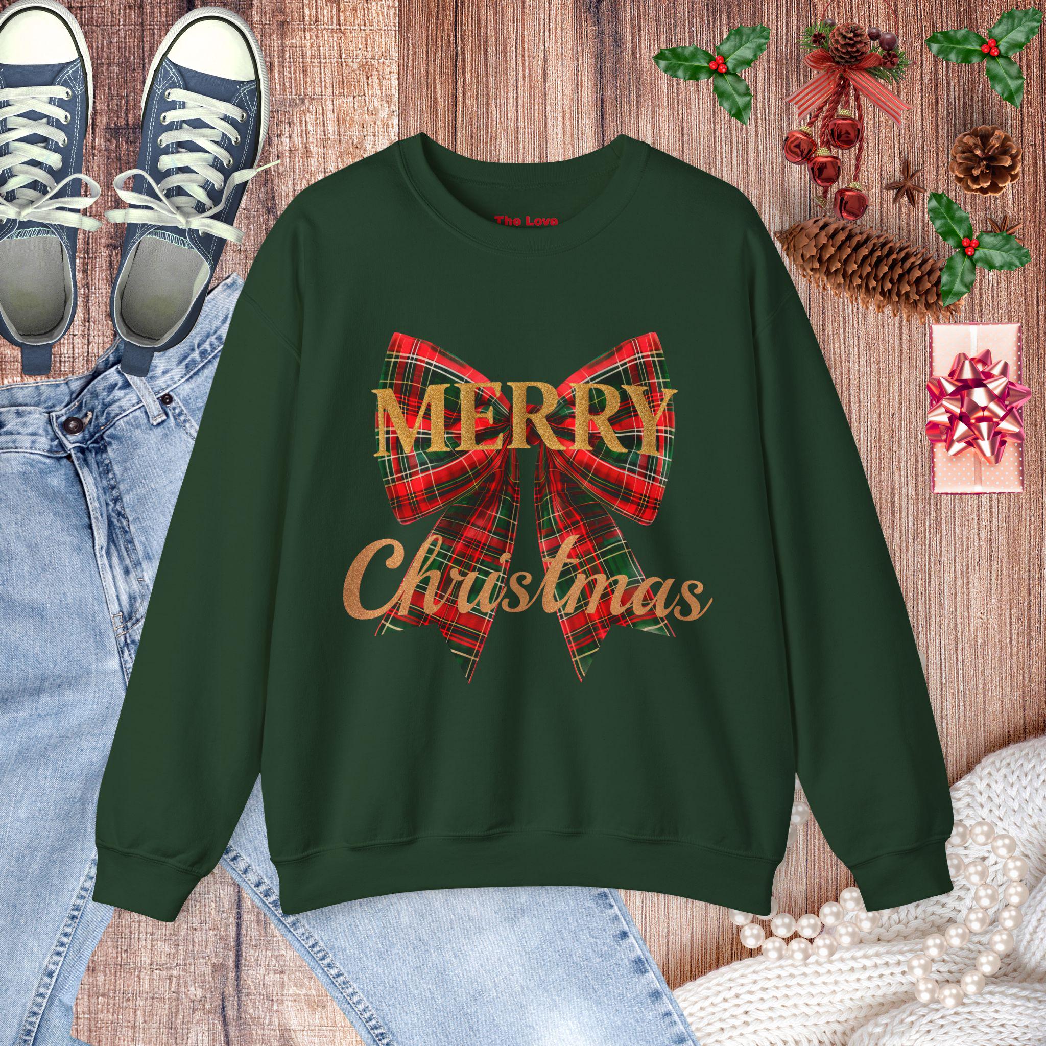 Luxury Christmas Sweatshirt Merry Christmas Tartan Bow Sweater Gold Green Red Holiday Sweater Elegant Xmas Pullover Festive Winter Gift