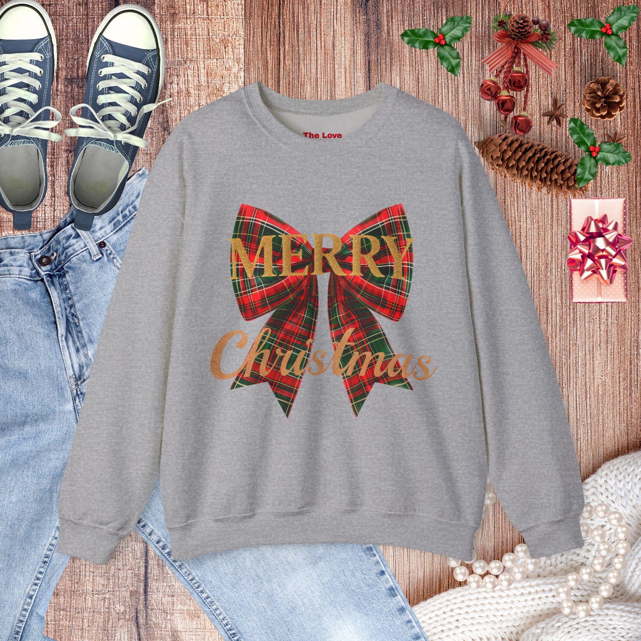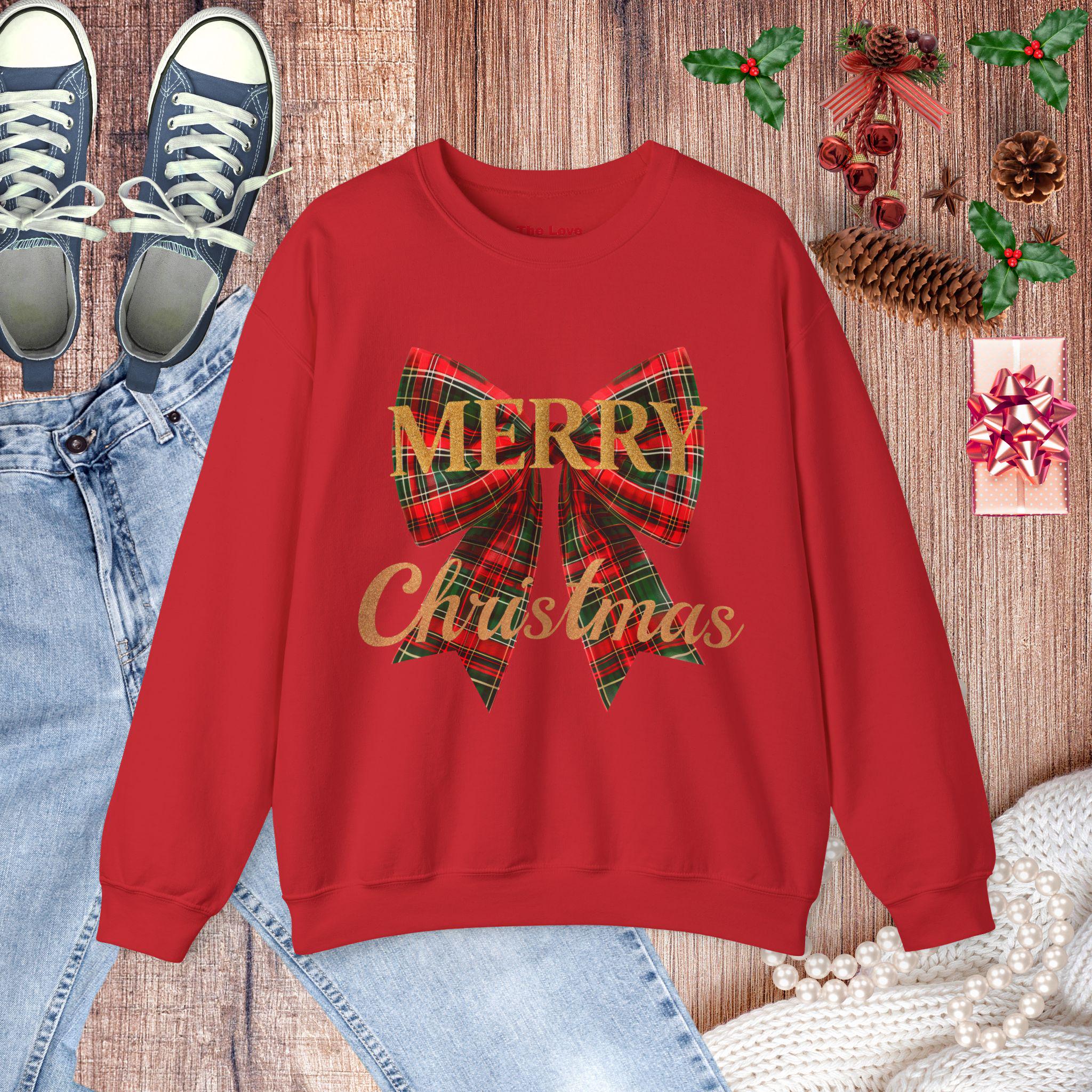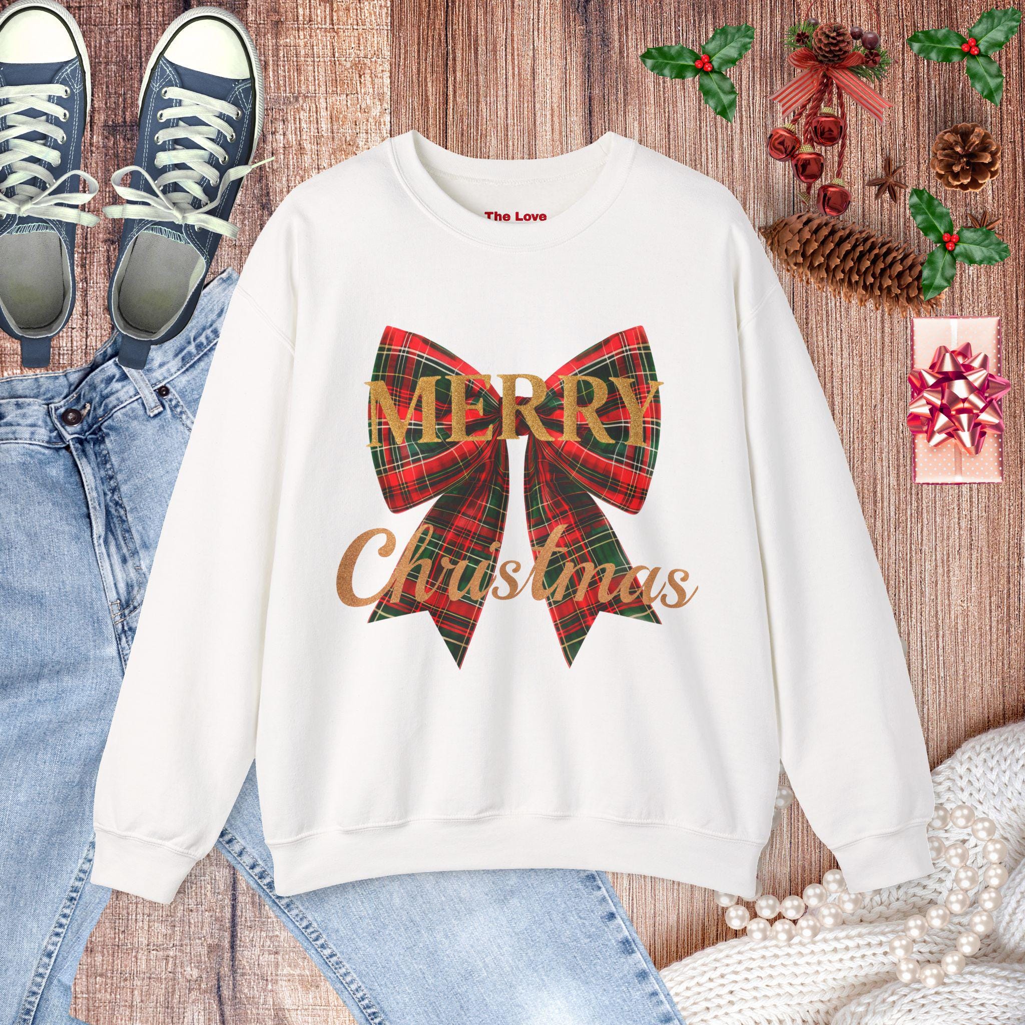 Luxury Christmas Sweatshirt Merry Christmas Tartan Bow Sweater Gold Green Red Holiday Sweater Elegant Xmas Pullover Festive Winter Gift